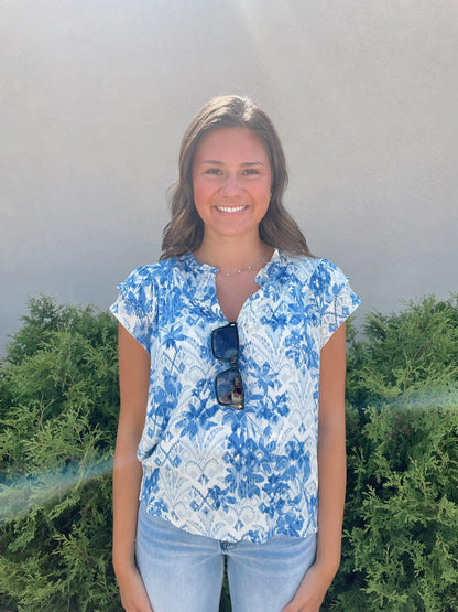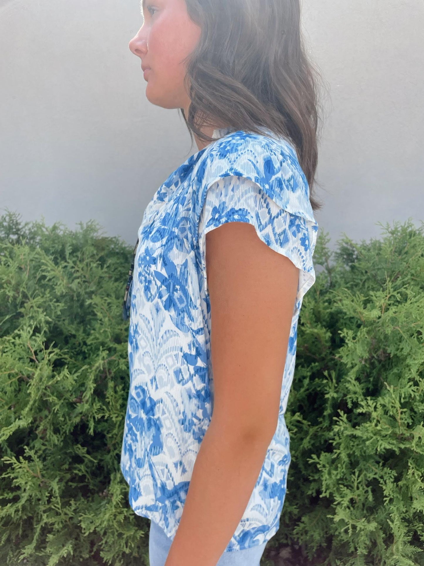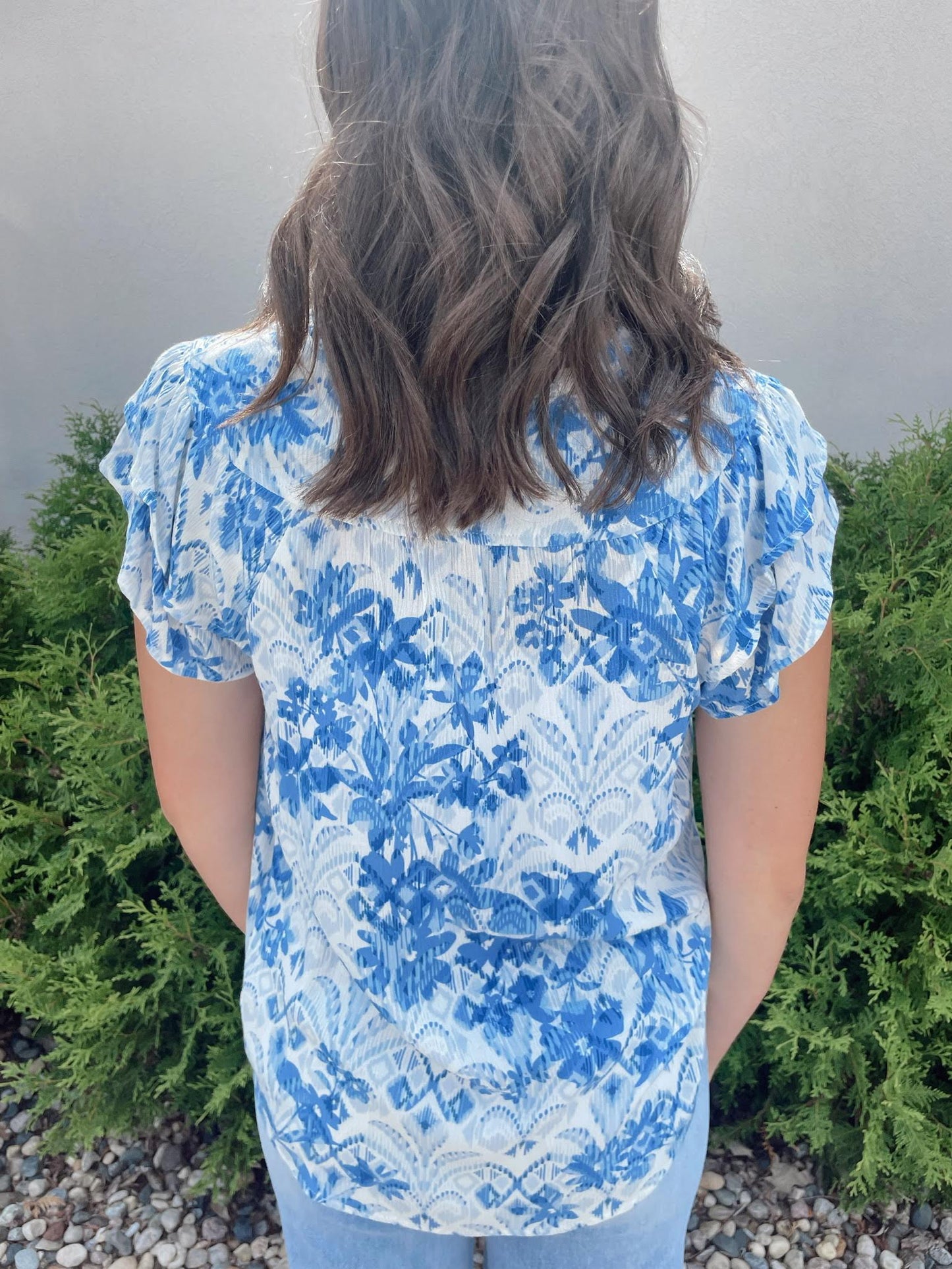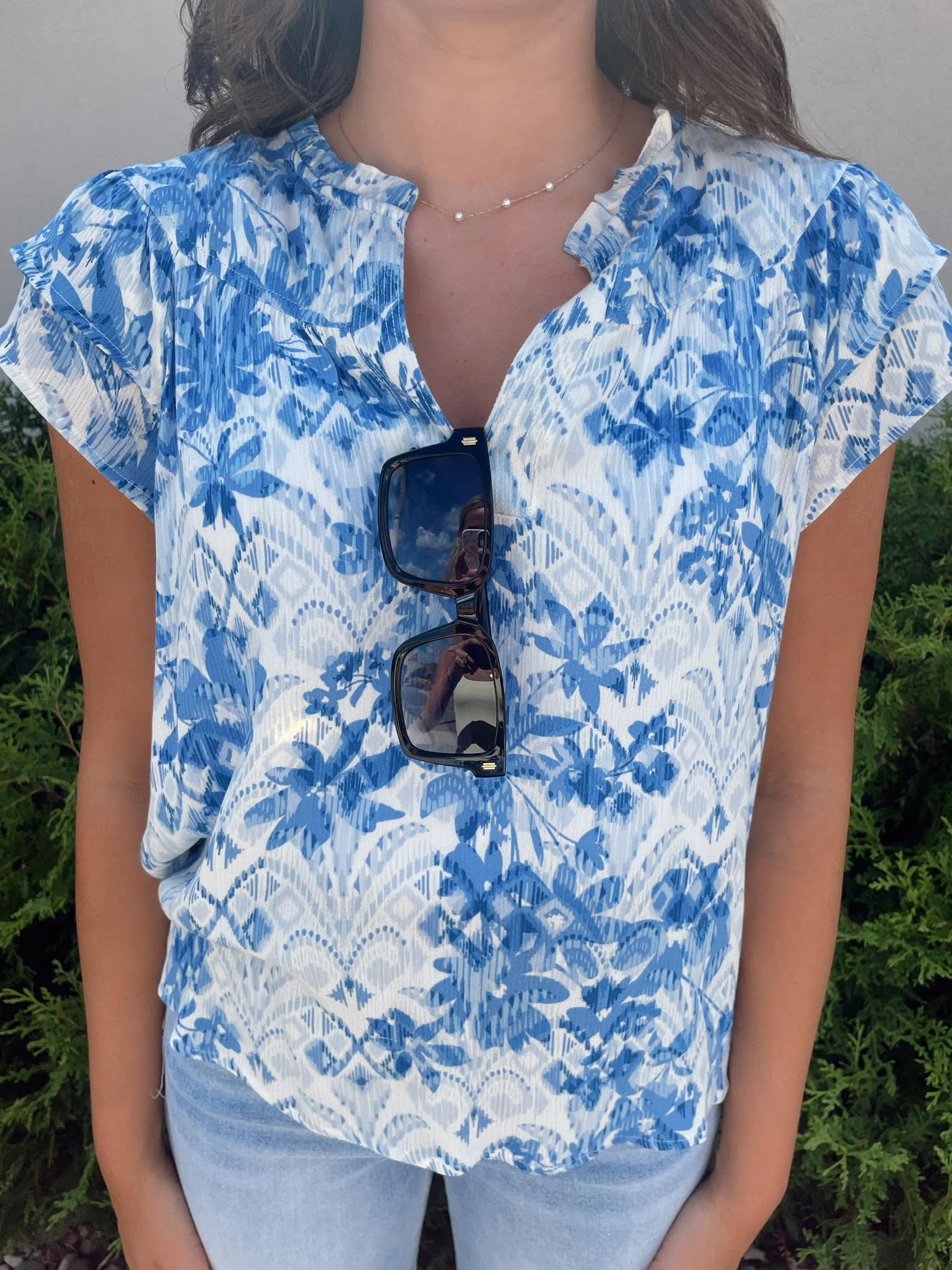 Unleash your feminine, bohemian side with our Agatha Ruffle Top. Made from floral tribal crinkle gauze, this top is perfect for warm weather with its light and breezy feel. The double ruffle sleeves and split neck add an extra touch of style, making it perfect for any occasion. Get ready to turn heads and feel confident in this must-have top!