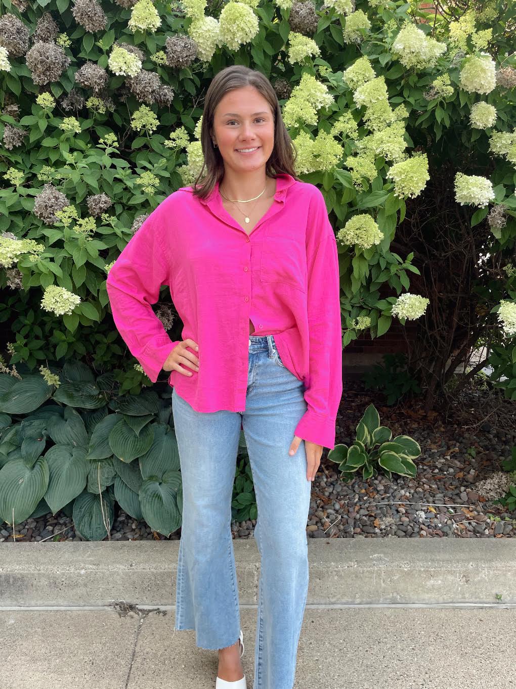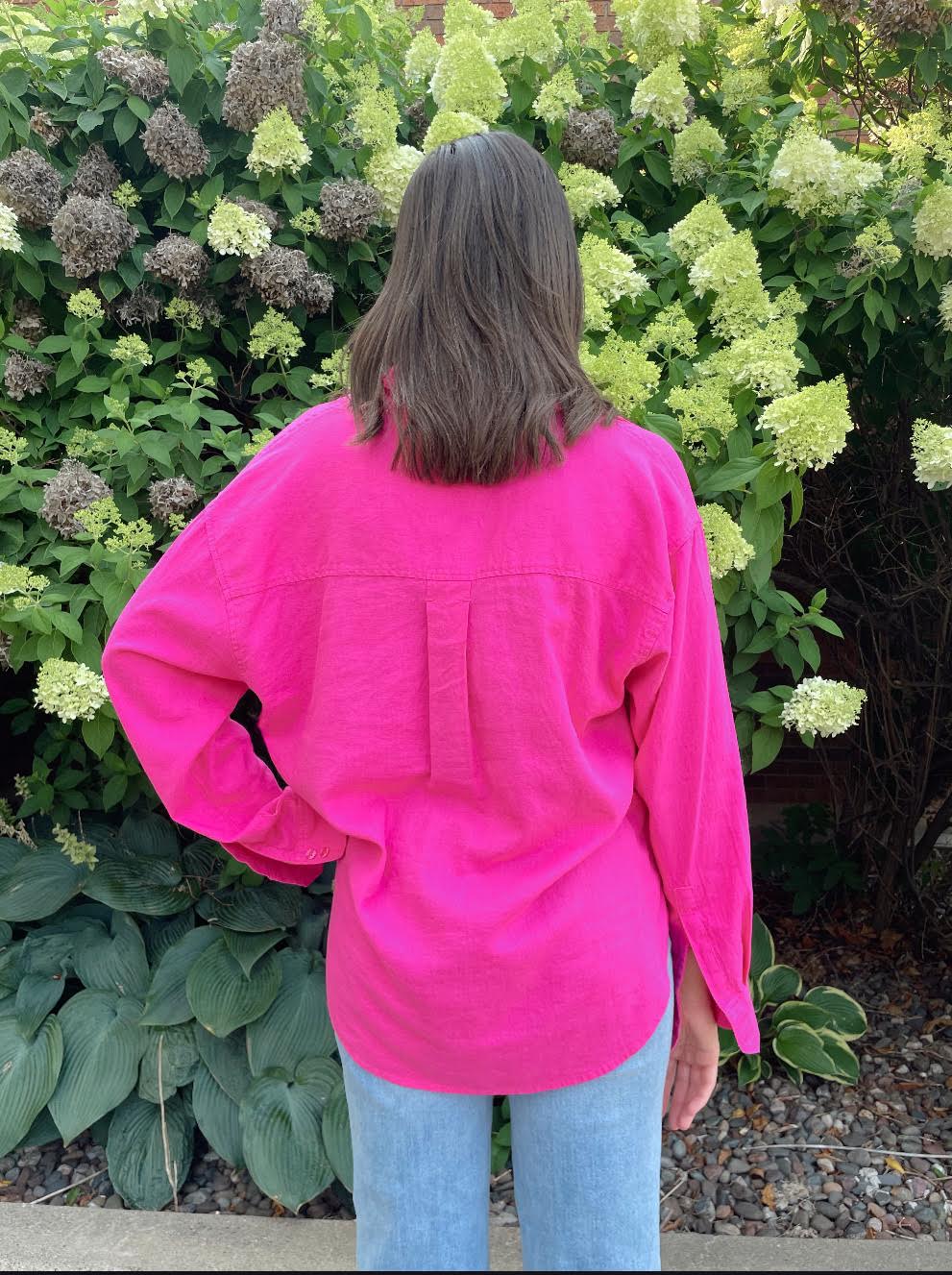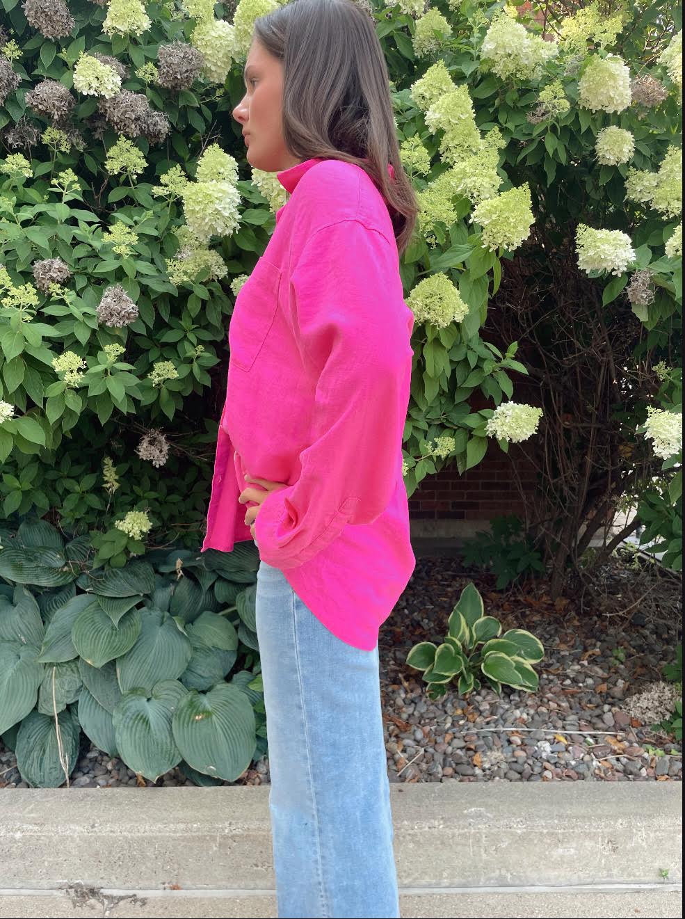 The Alfie Button Up Shirt is a timeless wardrobe staple with a relaxed, easygoing feel. Made from a midweight washed linen blend (55% linen, 45% rayon), it features a classic collared neckline, button front, and chest pocket for a clean, effortless look. The long sleeves and relaxed fit offer comfortable layering, while the heavy soft wash gives it that naturally lived-in texture. With a 29" length from shoulder, it’s perfect worn tucked, untucked, or layered over your favorite basics.