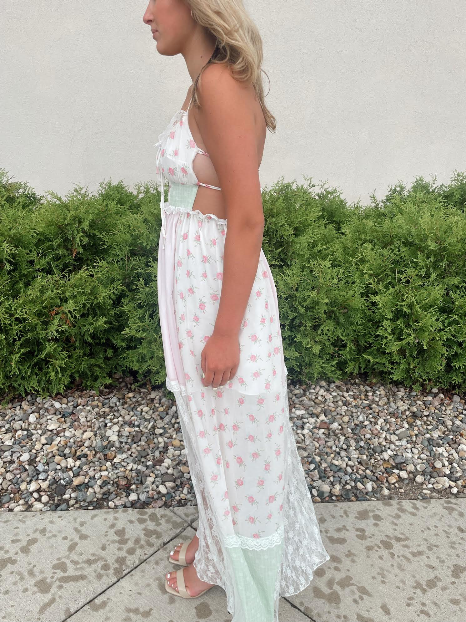 The Amiri Patchwork Maxi Dress is a dreamy blend of whimsical charm and vintage-inspired style. Designed with a flattering tie-back detail and delicate spaghetti straps, this dress offers a customizable fit that accentuates the waist while providing effortless comfort. Its full-length silhouette is adorned with a unique patchwork of pastel florals, soft lace, and subtle prints, creating a romantic and one-of-a-kind look. Perfect for garden parties, beachside strolls, or warm evening gatherings, the Amiri Maxi Dress brings a fresh, feminine energy to any summer wardrobe.