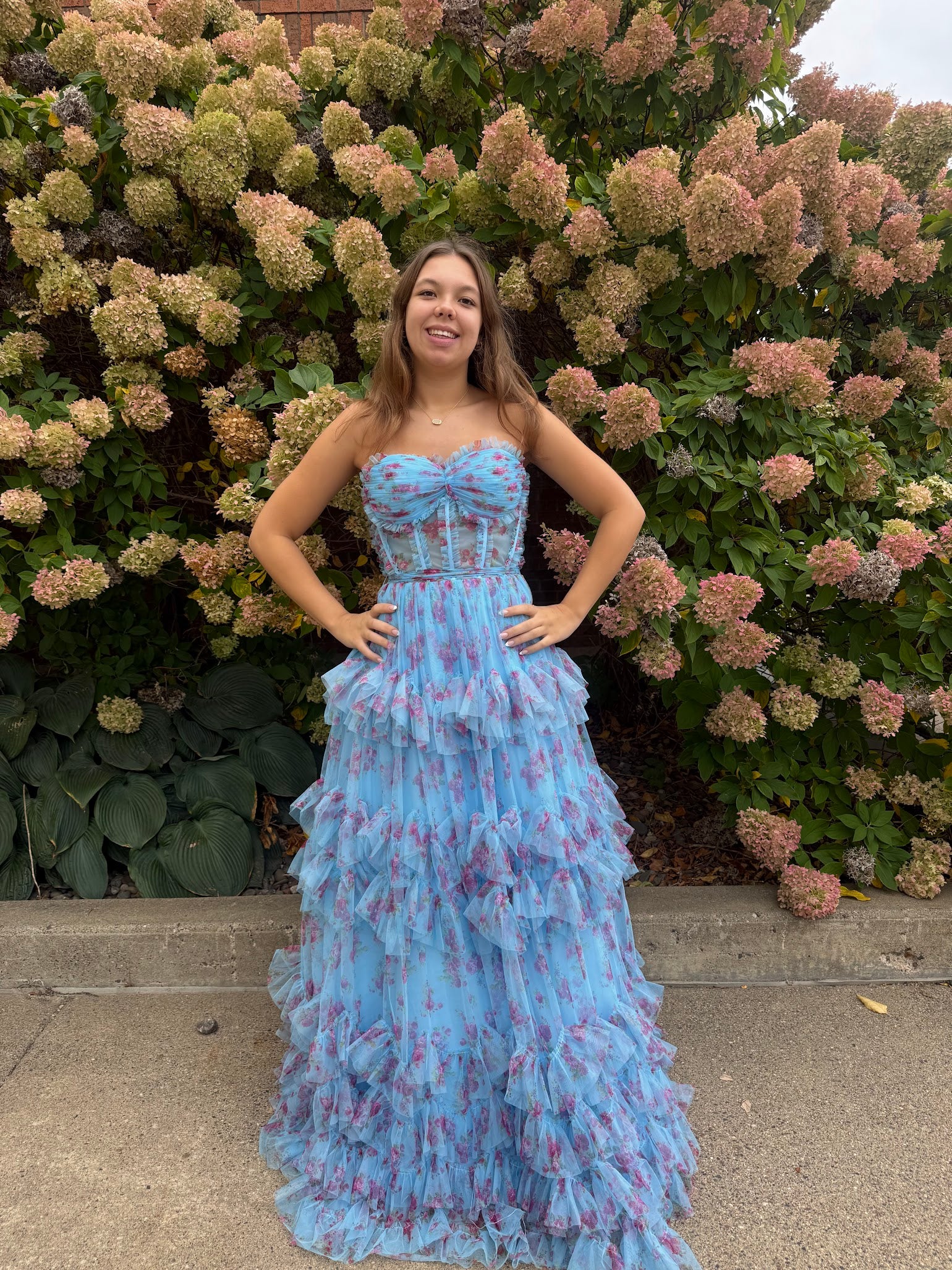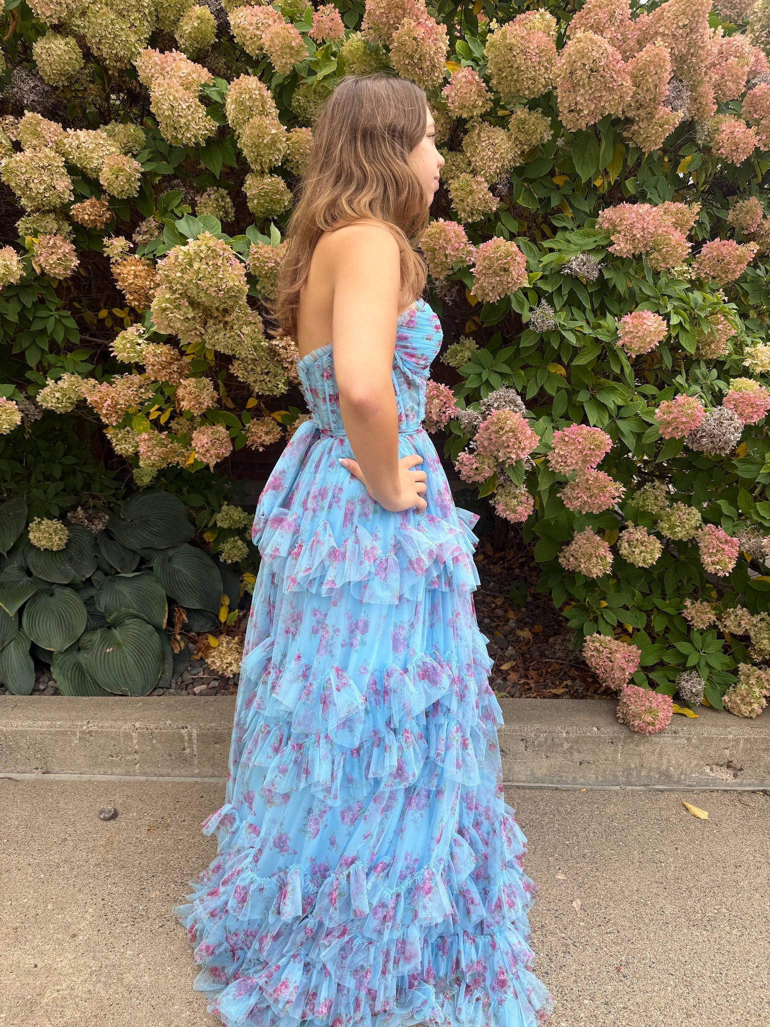 Behold the whimsical allure of this strapless A-line dress! A canvas of dreams, this enchanting gown features a floral-printed tulle that dances with a lively breeze. The tiered, layered ruffle skirt embodies a fairytale cascade, each tier a blooming petal in a garden of elegance. The structured bodice, with its sweetheart neckline, adds a touch of sophistication to the enchantment. It's more than a dress; it's a story waiting to be told, a celebration of romance and style. Step into a world of floral fantasies and tiered wonders, where every twirl is a dance in the garden of dreams. Don't see your size or color available? Call one of the stores today!