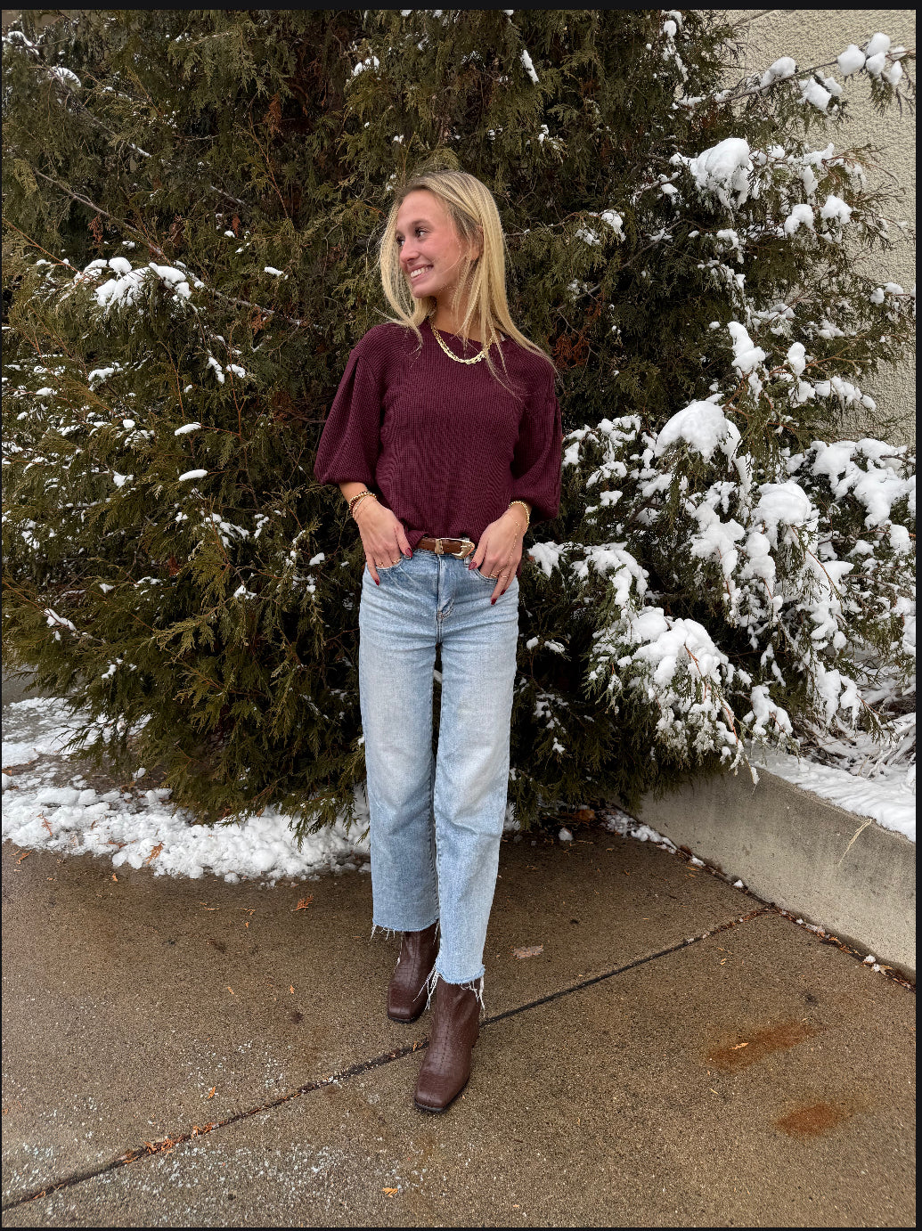 The Aubsy Bubble Top brings a chic, modern twist to cozy styling with its softly structured silhouette and elegant, gently puffed sleeves. Crafted in a rich, deep hue, this top features a relaxed fit that drapes effortlessly while still feeling polished. Perfect for dressing up or down, it pairs seamlessly with matching bottoms for a coordinated look or denim for an elevated everyday outfit. A versatile piece that blends comfort with understated sophistication.