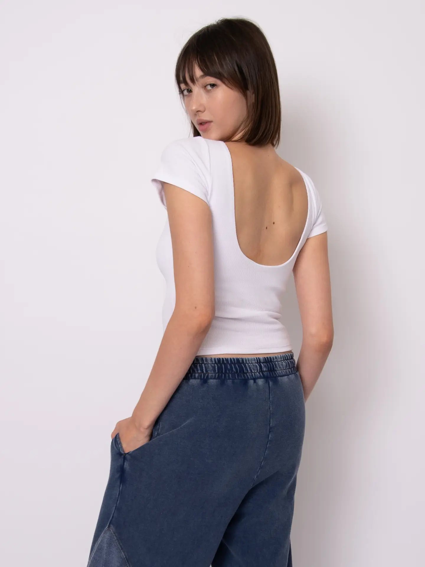 Designed to feel like a barely-there layer, this white second skin top hugs the body with a smooth, ultra-soft fit. Crafted from a stretch fabric that moves with you, it contours seamlessly for a sleek, flattering silhouette. The short sleeves keep it effortless and versatile, while the low scoop back adds an unexpected, elegant edge. Perfect for layering or wearing on its own, this is the kind of essential that elevates everything you pair it with—day or night.