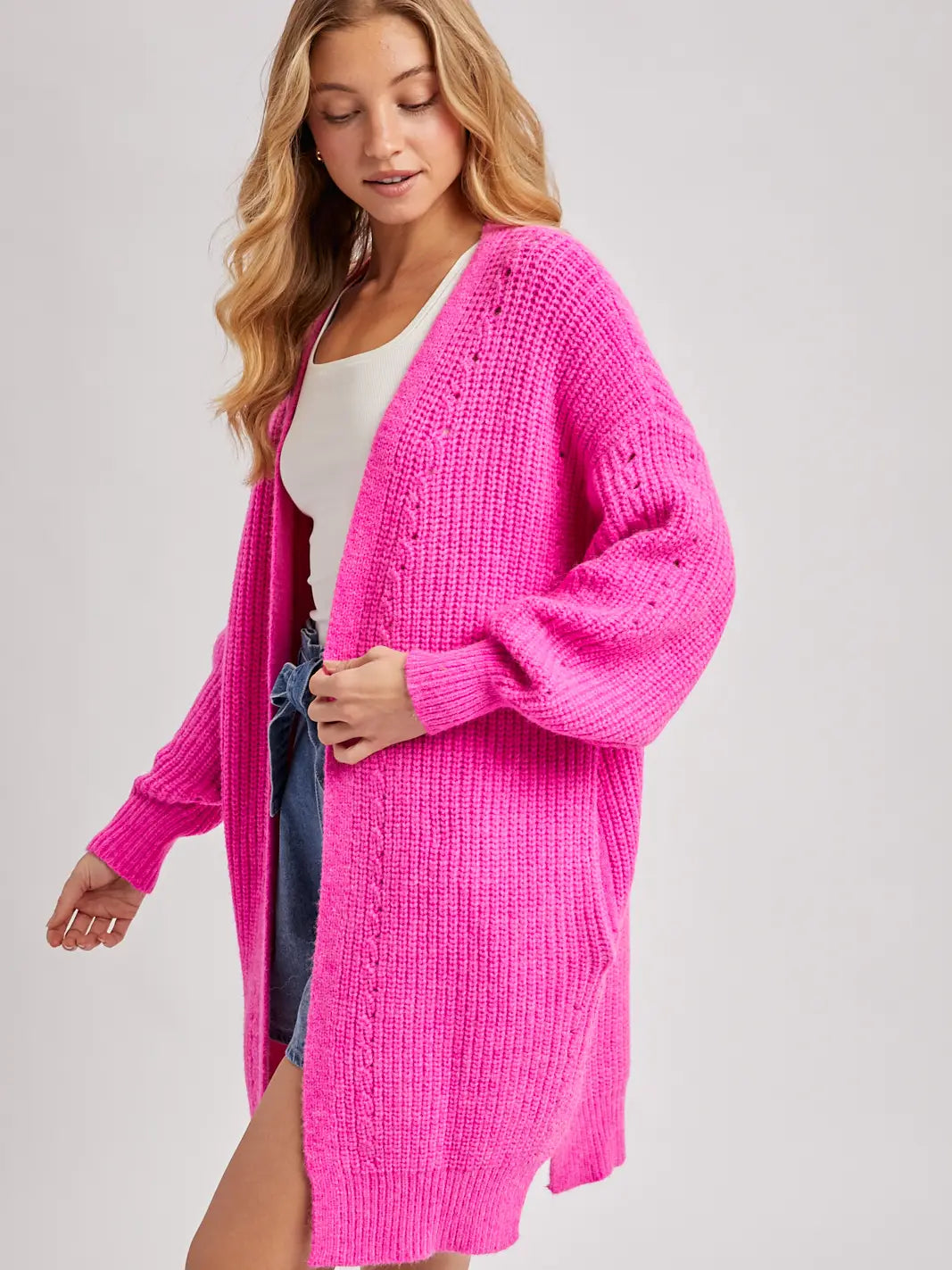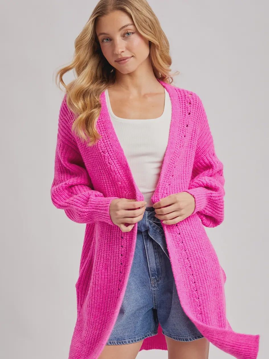 Cozy, relaxed, and effortlessly stylish, the Bummer Cardi is the layering piece your wardrobe has been waiting for. This long, open-front cardigan features a chunky ribbed knit and full-length sleeves with a subtly oversized, balloon-inspired silhouette gathered neatly at the cuffs. Falling to about mid-thigh, it’s designed with two roomy front pockets for added comfort and practicality. Delicate open-knit details along the sleeves and side seams bring a touch of texture and charm to this everyday essential. Perfect for throwing over tees, tanks, or dresses, it’s the ultimate grab-and-go layer for any season. Model is 5'9" and wearing a S/M.