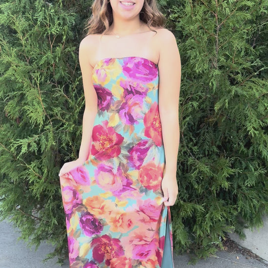 Romantic and effortlessly sleek, the Cali Strapless Maxi is designed to make an entrance. Crafted from silky floral satin with a flattering bias cut, it features a strapless neckline with an elastic band and gel grip tape for a secure, stay-put fit. A hidden side zipper keeps the silhouette smooth, while a side slit adds just the right amount of movement and allure. Fully lined for comfort with a touch of stretch, it’s the perfect dress for warm evenings, weddings, or wherever the night takes you.