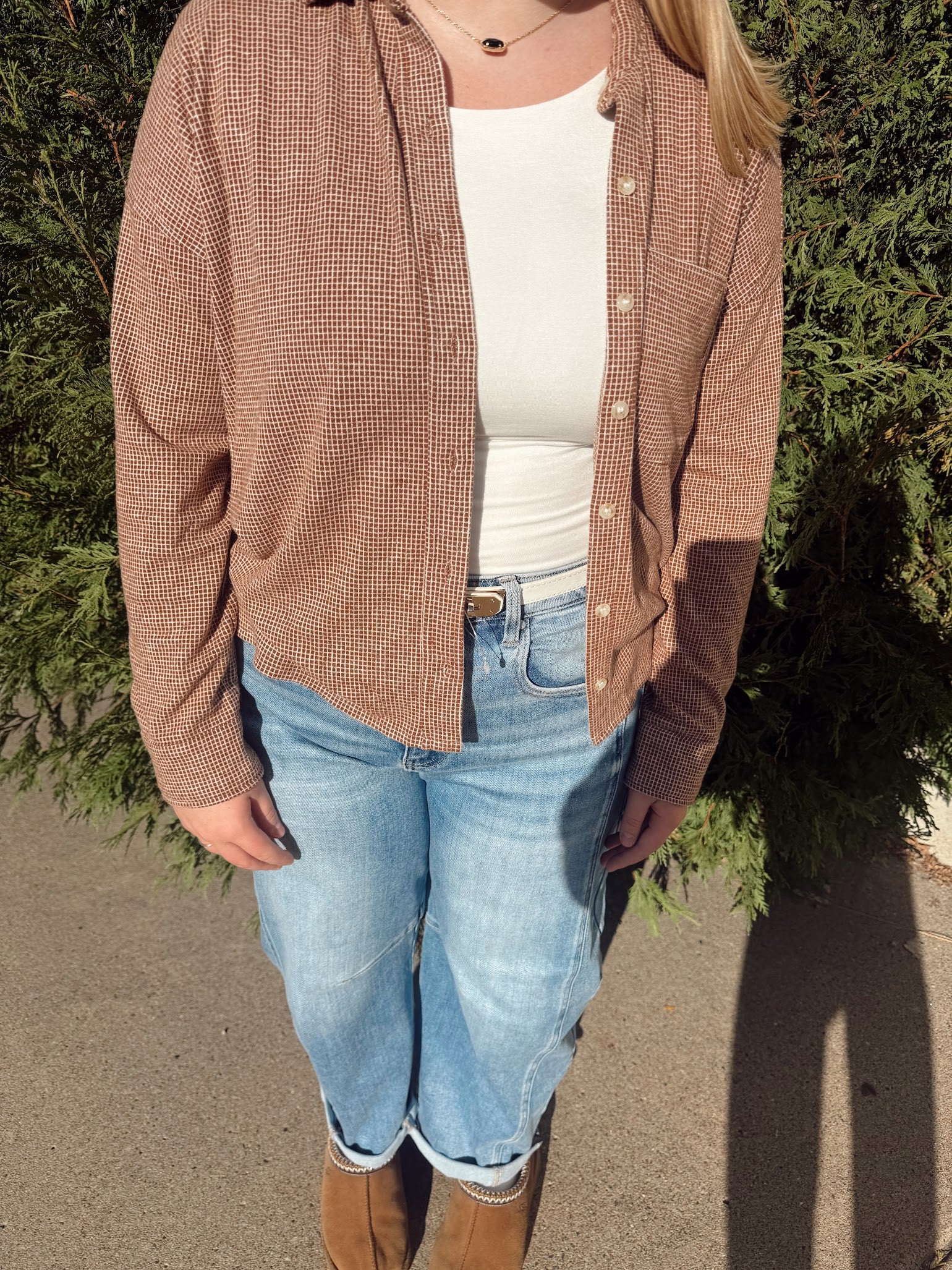 An effortless twist on a classic, the Coralie Shirt is featured in a soft brushed knit with a subtle micro grid print for added texture and charm. Designed with a relaxed fit, it includes a collared neckline, button front closure, drop shoulders, and a single chest pocket for that perfectly laid-back look. Easy to dress up or down, it’s a versatile staple for any season.