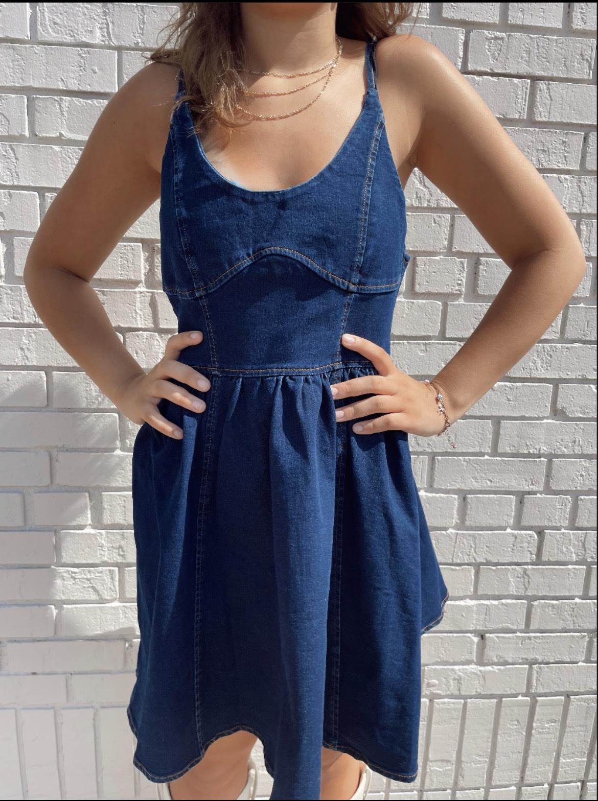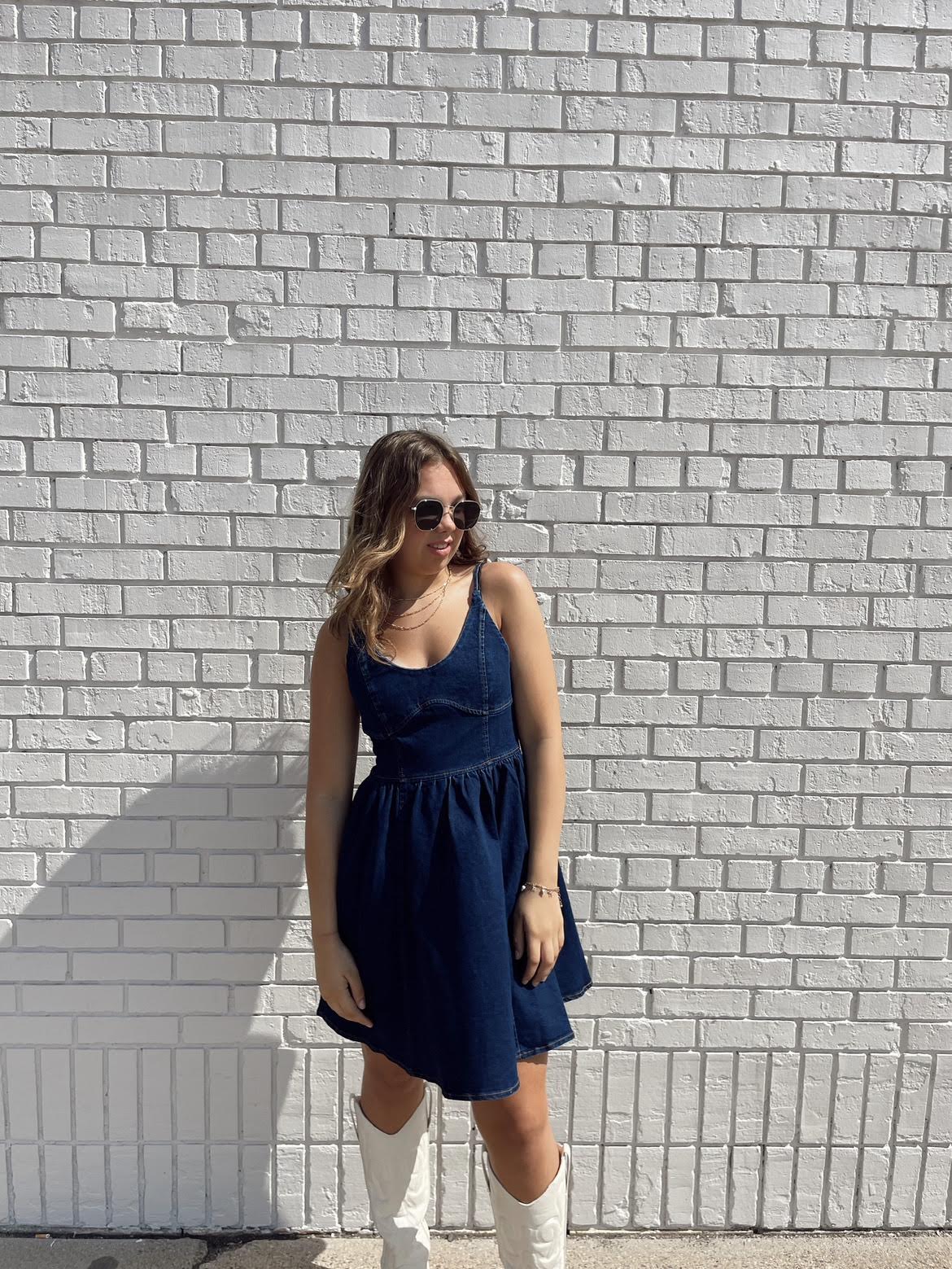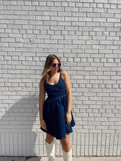 The Darlin Denim Dress is the perfect blend of flirty and classic, making it a must-have for any wardrobe. Featuring delicate spaghetti straps and a flattering fitted bodice, this mini dress is crafted from a rich dark wash denim that gives it a timeless, effortlessly cool vibe. The cinched waist and flared skirt add a playful, feminine touch, while the subtle seam detailing enhances the silhouette. Whether you're pairing it with boots for a bold daytime look or dressing it up with heels for a night out, the Darlin Denim Dress is your go-to for easy style and charm.