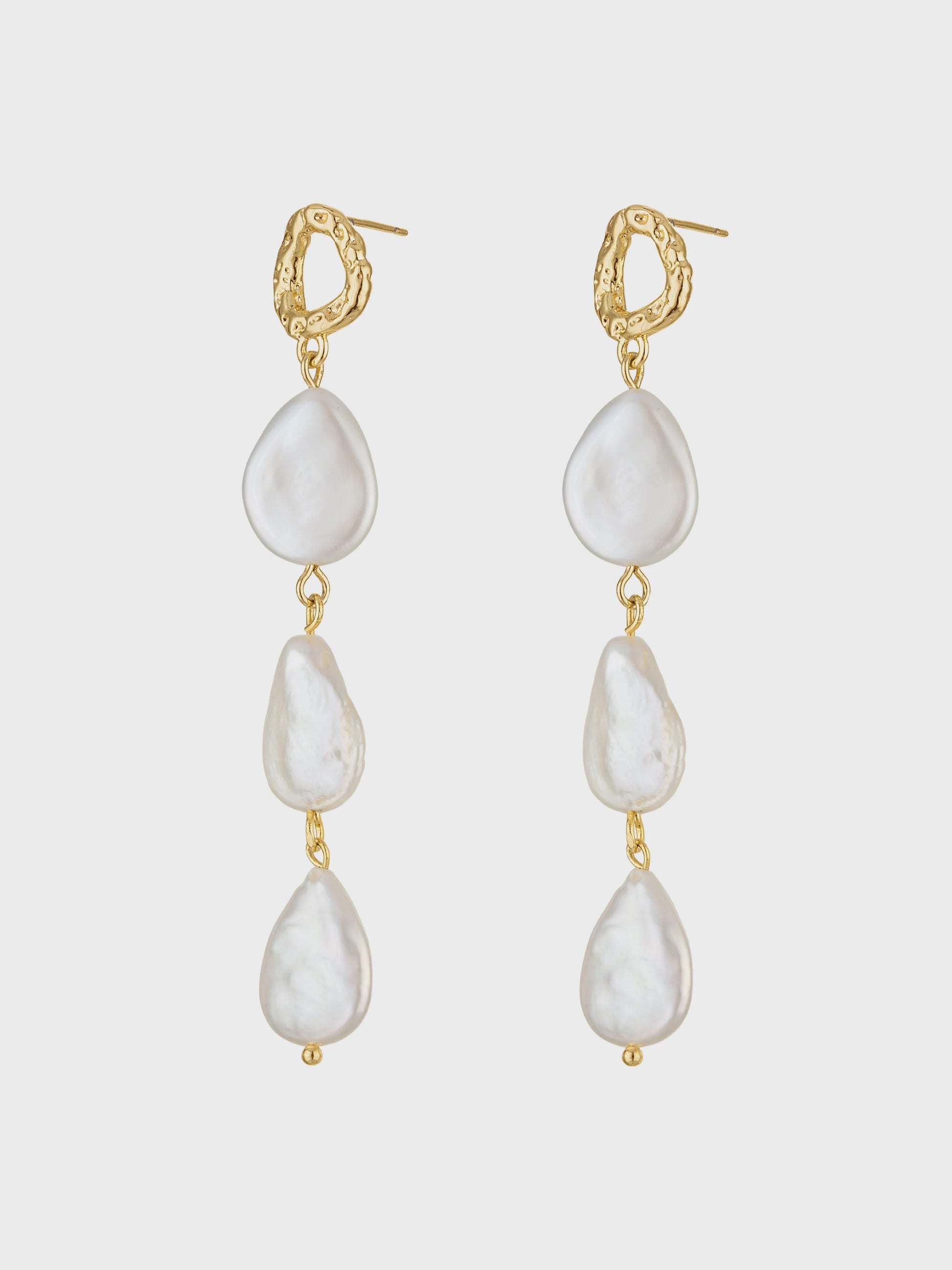 The Evie Pearl Drop Earrings bring a touch of organic elegance to any look. Featuring a hammered gold stud and a cascading trio of lustrous freeform pearls, these earrings blend natural beauty with sculptural sophistication. Whether styled solo for a soft, graceful statement or paired with the Merrick Hoop Earrings for added texture, they radiate timeless charm. Perfect for bridal parties, special occasions, or everyday elegance.