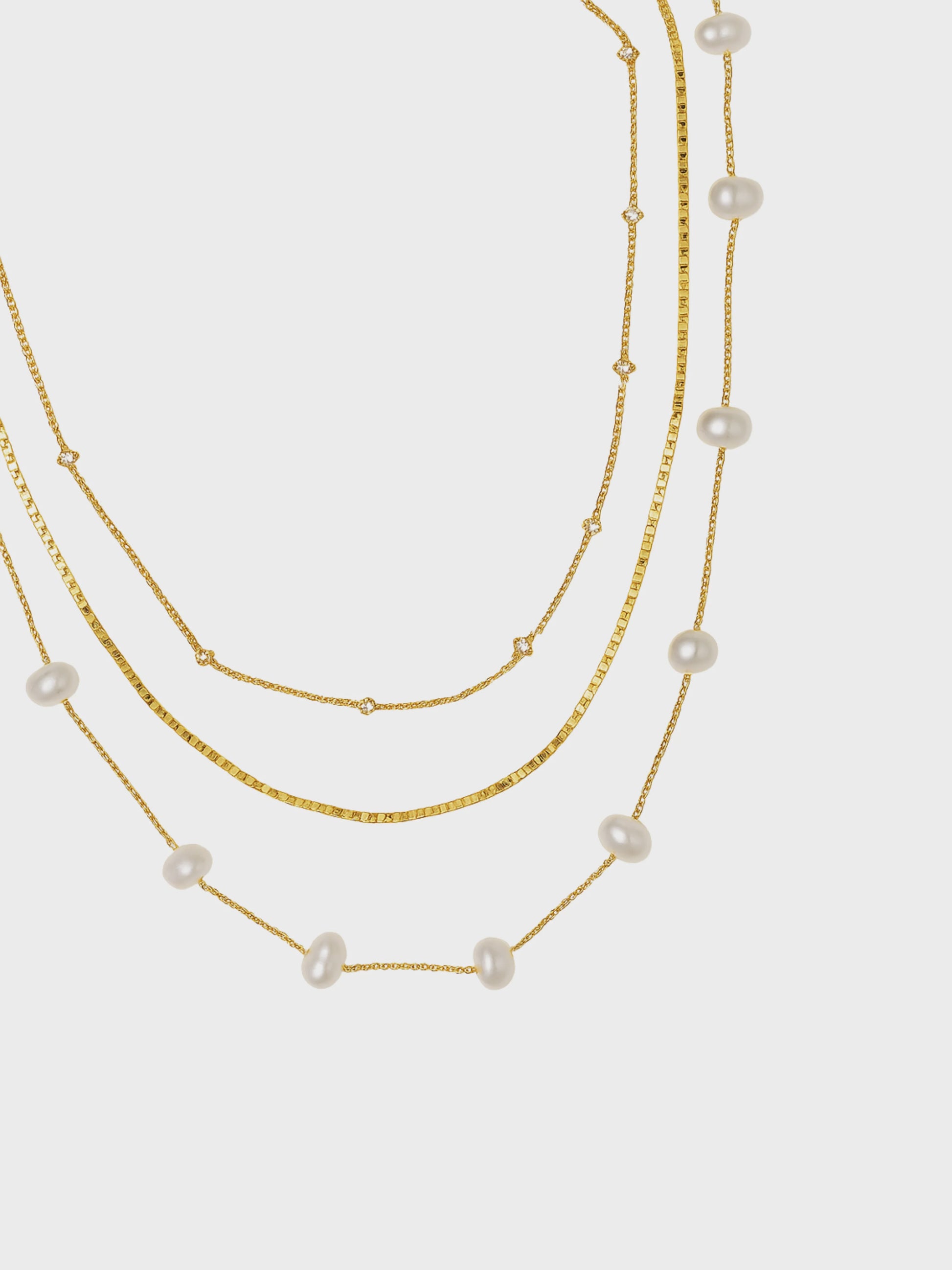 Personify classic splendor with the Folly Layer Necklace, a stunning fusion of timeless elegance and modern allure. This layered design features three cascading gold chains, with petite crystals on the top strand and lustrous pearls on the bottom, creating a captivating rhythm and sophisticated shine. Wear it solo to elevate any outfit or pair it with our Korey Pearl Hoops for a perfectly harmonized look. A thoughtful gift for a stylish partner, sister, or loved one—this necklace is the ultimate way to say, “You deserve to shine.” Gold-filled and hypoallergenic. Final sale.