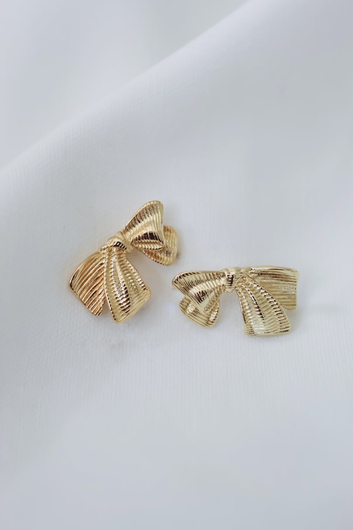 Elegant yet timeless, the Izzy Bow Studs earrings perfectly balance sophistication with a playful touch. Each gold-filled, hypoallergenic earring showcases a delicate bow design, featuring a central knot with finely ribbed texture that catches the light beautifully. Wear them alone for a refined look or pair with our charm bar necklace to elevate your brunch outfit. Ideal as a meaningful birthday or anniversary gift, these studs are a lasting reminder of your special bond.