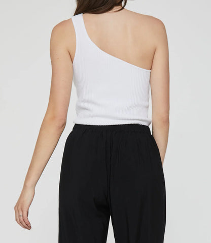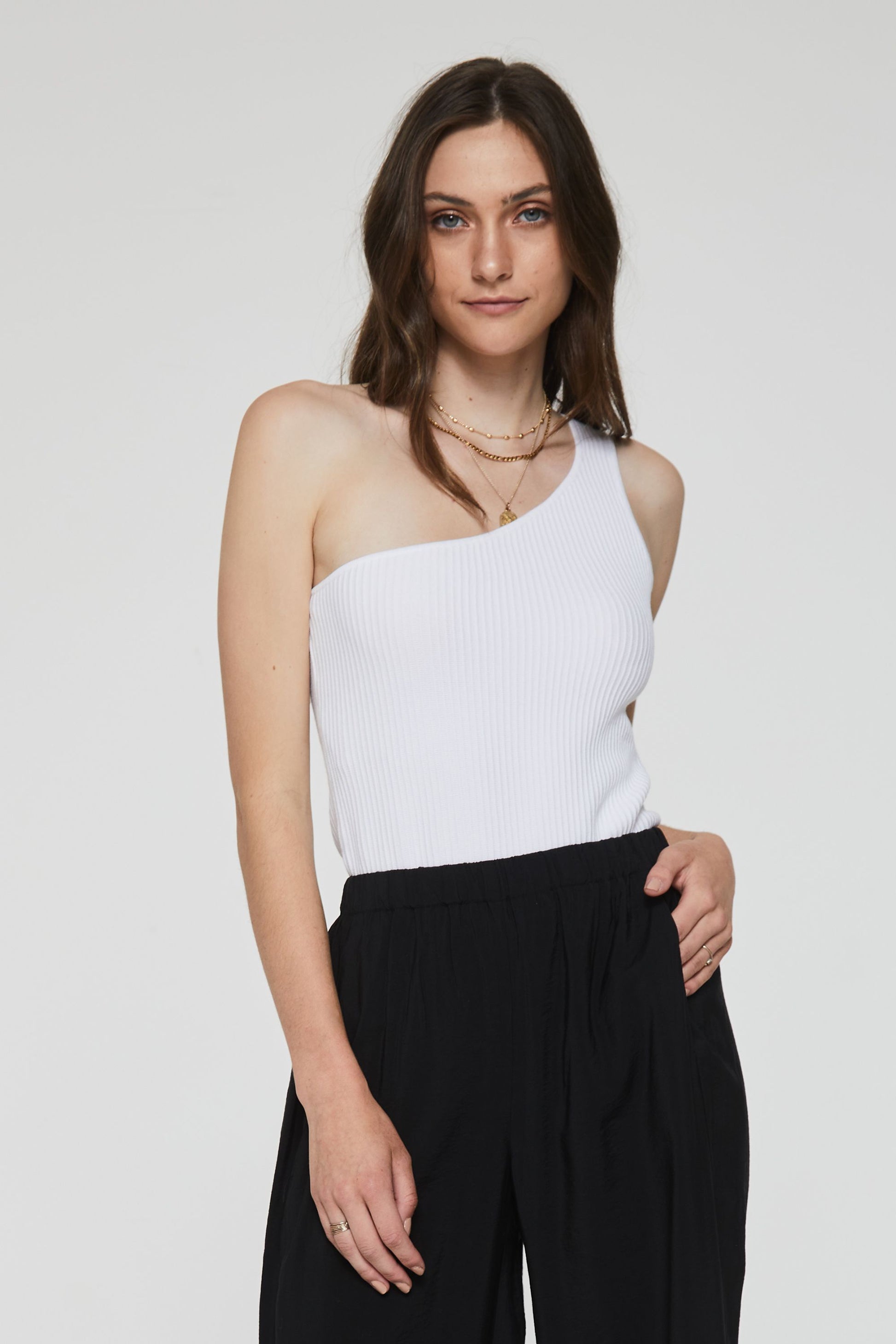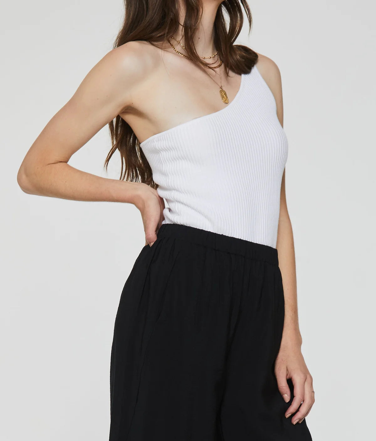 The JAIME tank is an asymmetrical ribbed sweater with an off-the-shoulder, featuring a self neckline and armhole band. Exuding femininity with a touch of flirtatiousness and trendiness. Perfect for on the go crafted with solid color yarn for a form-fitting look. Final sale.