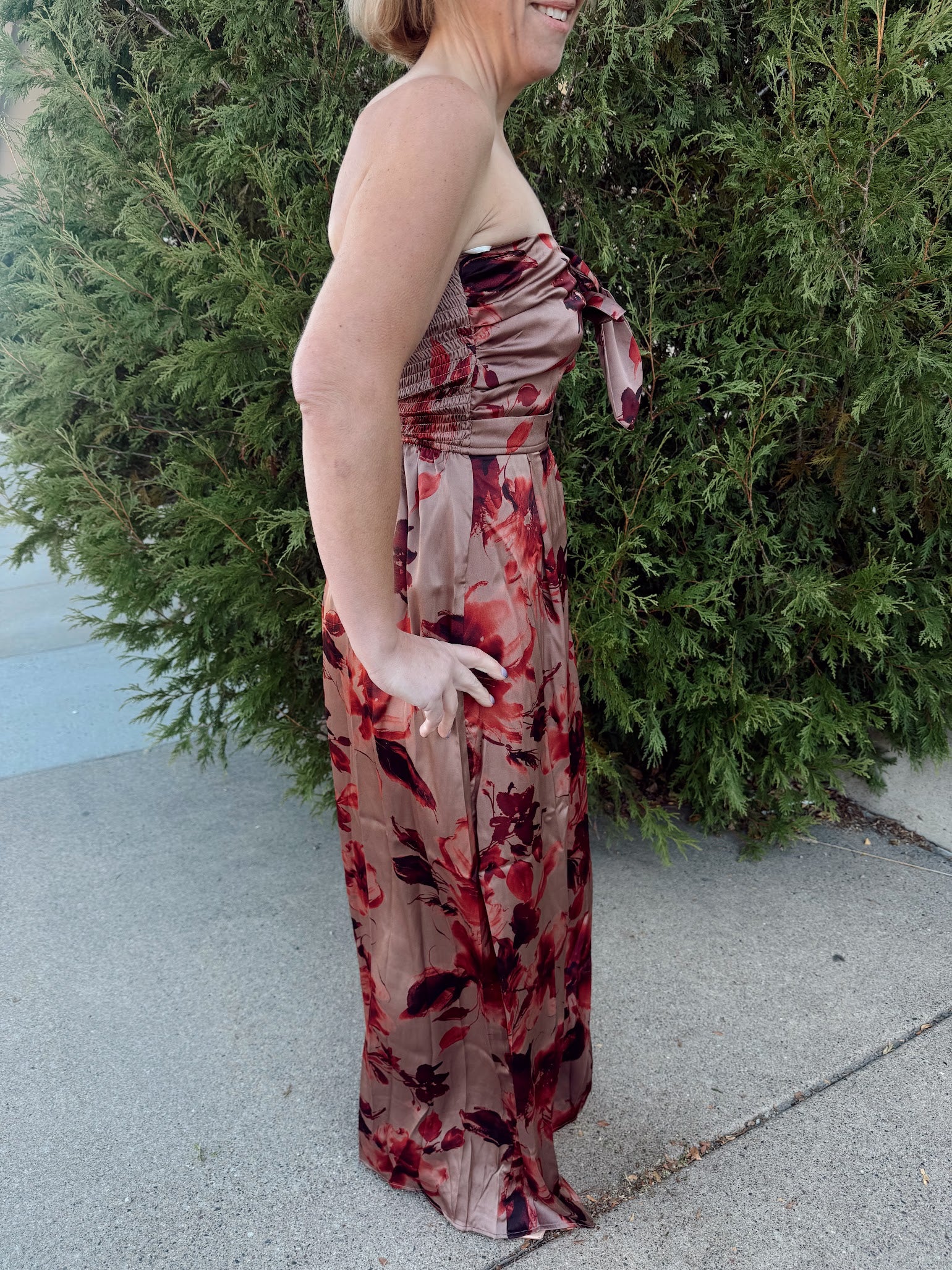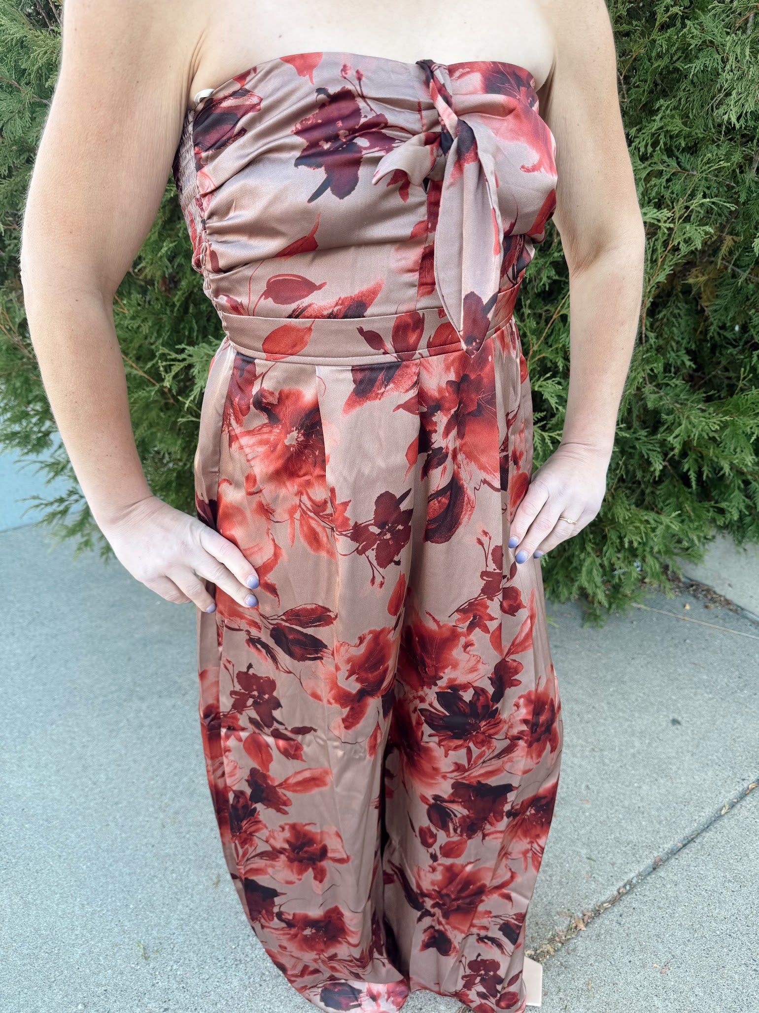 The Jessie Jumpsuit features a chic tube silhouette with a tie-front chest detail and an elastic back for a comfortable, customizable fit. The waisted design flatters your shape, making it the perfect blend of relaxed and refined. Ideal for everything from casual days out to stylish evenings, this jumpsuit is a versatile wardrobe essential.