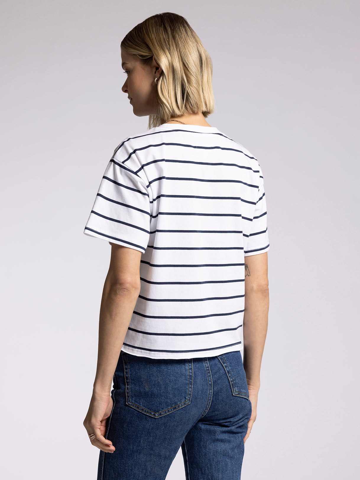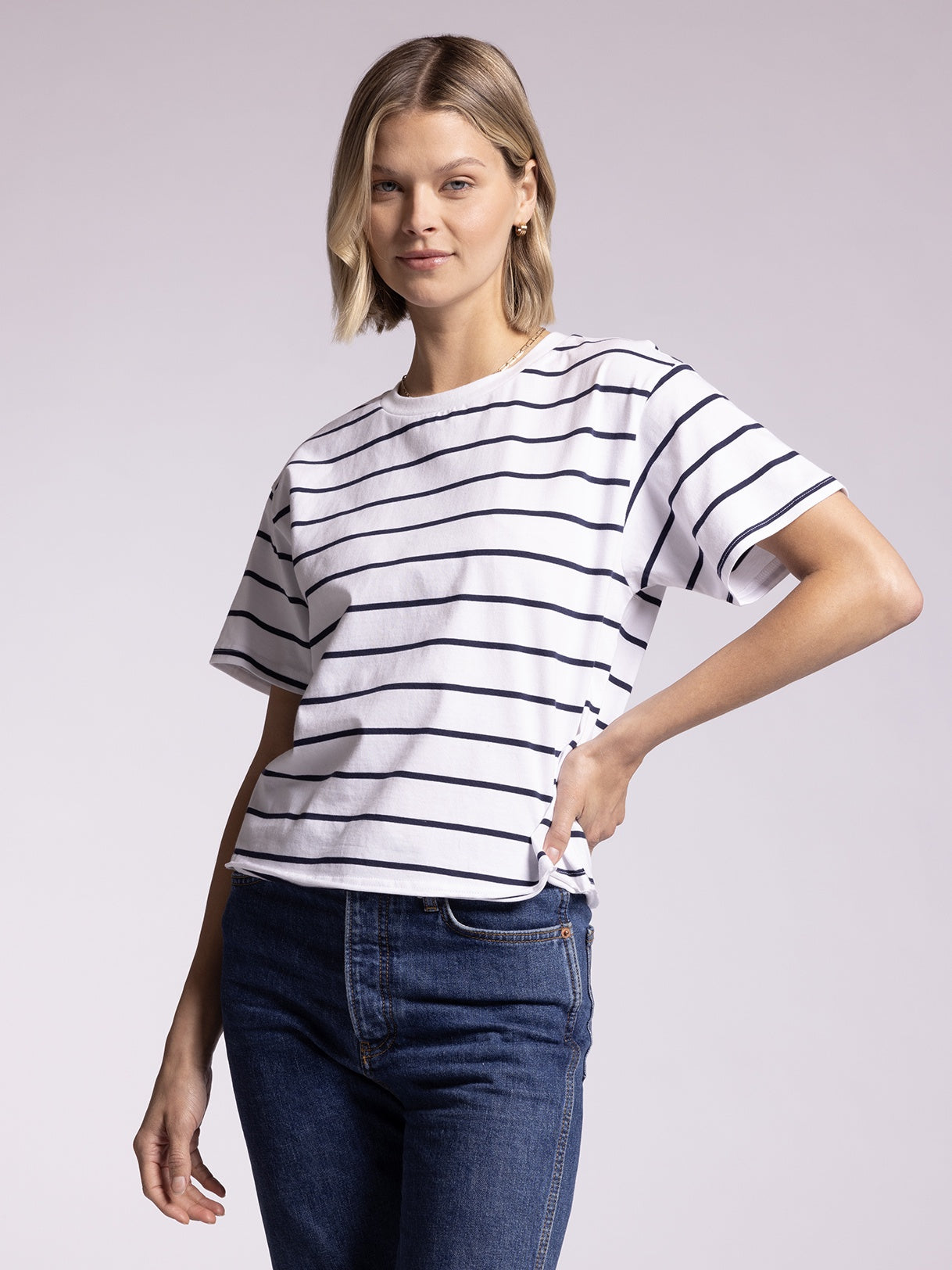 The Katelin Tee is the definition of effortless essential, featuring a classic cropped silhouette with raw hemlines that give it a true lived-in, casual vibe. It has a comfortable crew neckline and a slightly cropped length, making it perfect for layering or pairing with high-waisted bottoms for an easy, stylish look.