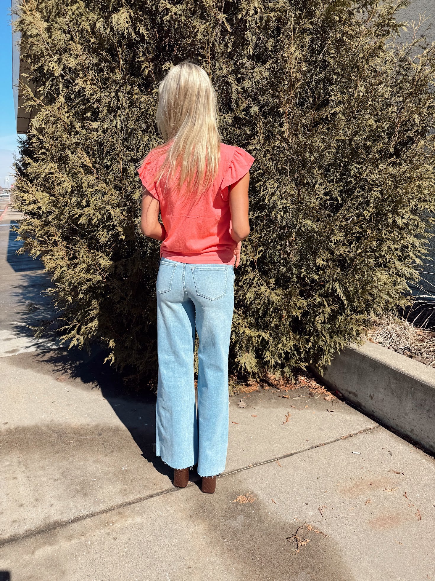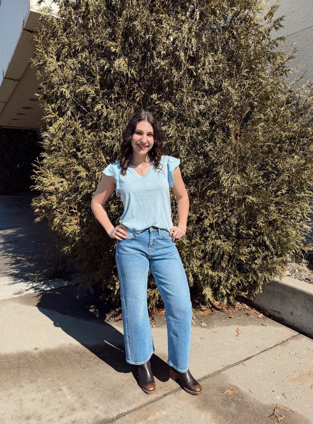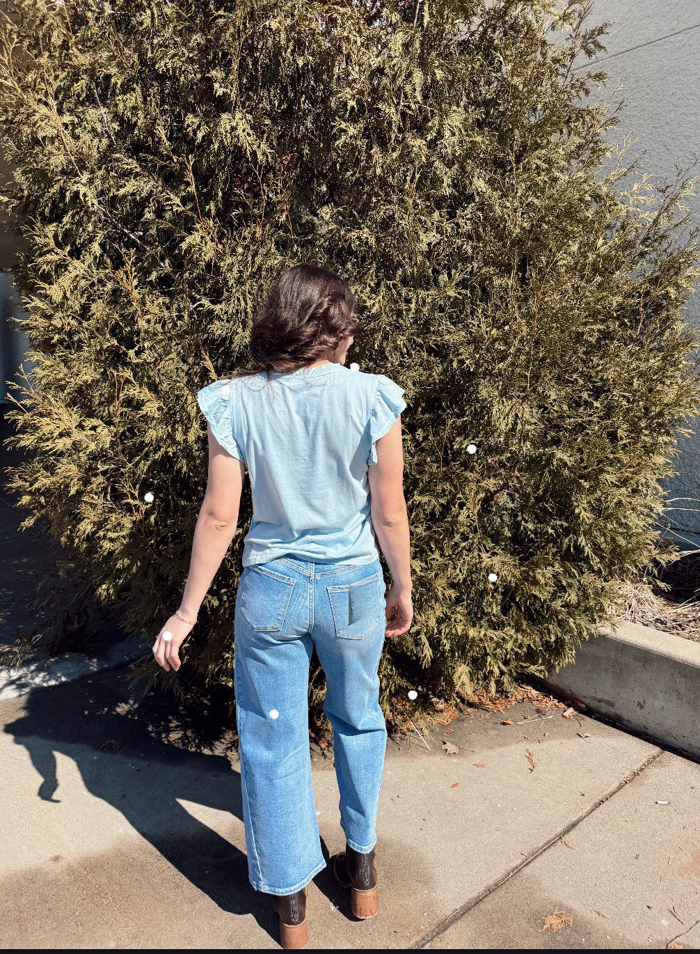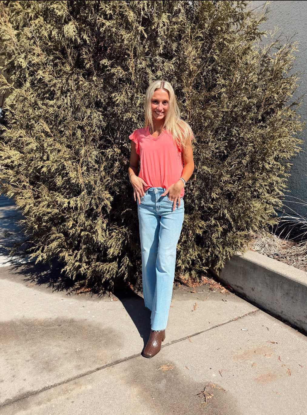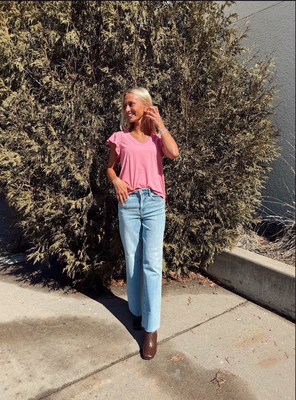 This V-neck flutter sleeve top is the definition of effortless charm. Designed with a flattering neckline and soft, airy sleeves, it brings movement and a touch of romance to any outfit. The easy silhouette makes it perfect for pairing with denim, skirts, or tailored pants for a look that feels put-together without trying too hard.
