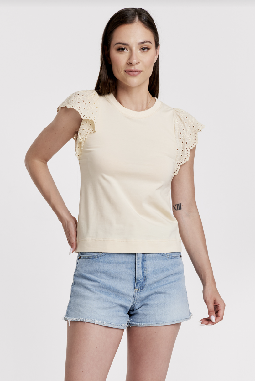 The Kiara Eyelet Ruffle Sleeve Top blends effortless elegance with everyday comfort. Crafted from soft, breathable cotton with a hint of stretch, this versatile piece features delicate eyelet detailing and charming ruffle sleeves for a feminine touch. Designed with a classic fit for easy transitioning between seasons, it’s a timeless wardrobe staple that pairs beautifully with both denim and skirts. Body length from HPS: 22", sleeve length: 3", bust: 34" (model wearing size XS). 95% Cotton, 5% Polyurethane. Machine wash cold, tumble dry low.