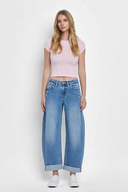 Elevate your denim game with the Luca Super High Rise Barrel Jeans — a bold silhouette with thoughtful details. Made from comfort stretch denim, these jeans feature an 11" super high-rise waist and soft pleating for a flattering fit through the hips. The standout double cuff hem adds structure and style, while the cropped 26.5" inseam and 17" leg opening create a modern barrel shape that moves effortlessly from day to night. Perfect with boots or heels for a fresh, fashion-forward look. Model is 5'10" and wearing a size 26.