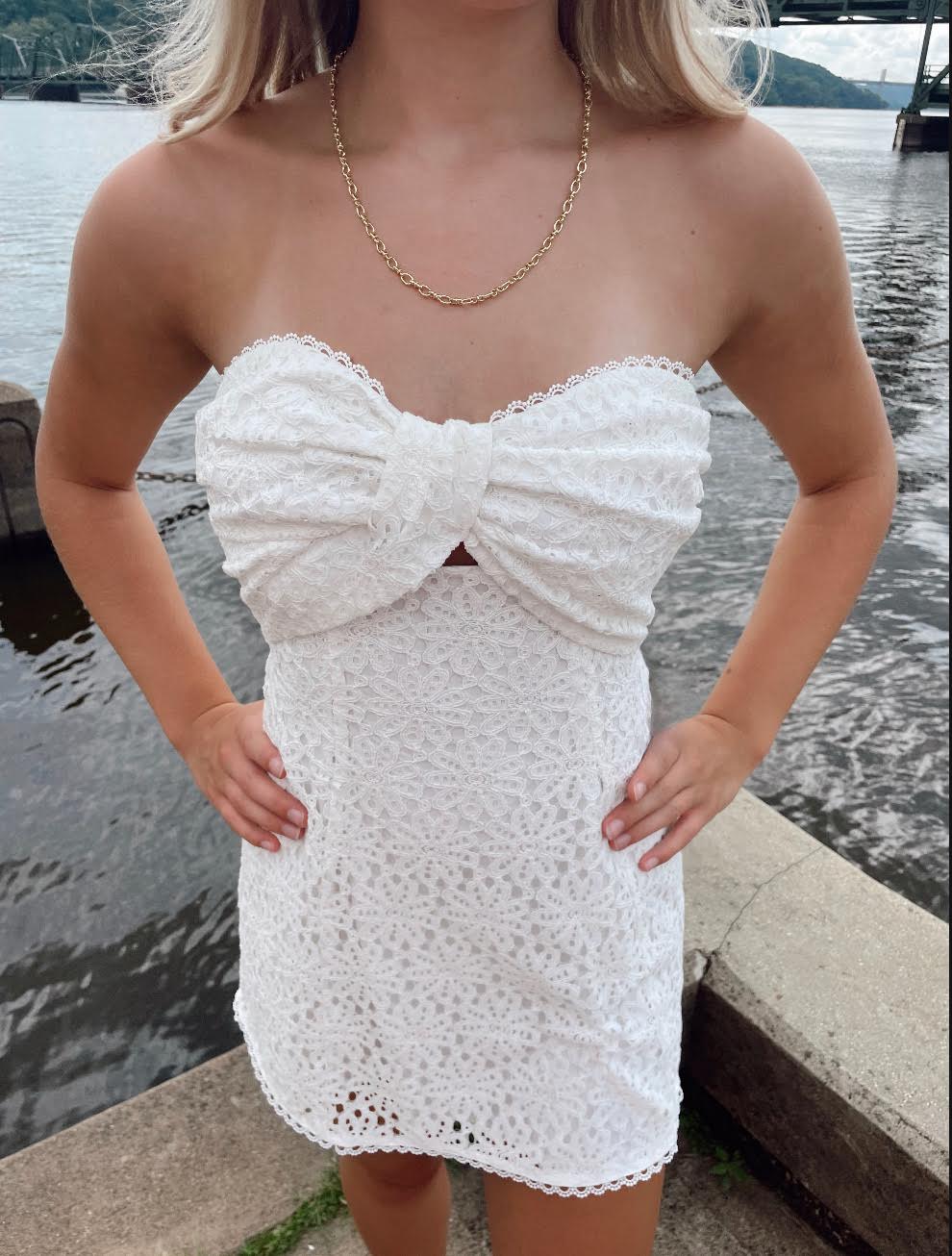 The Meg Pie Mini Dress is a charming strapless eyelet mini that captures the essence of carefree summer style. Designed with a fitted bodice and a softly flared, pieced skirt, this dress features delicate eyelet embroidery for a romantic, airy feel. The strapless neckline adds a touch of effortless elegance, perfect for warm days and sunset evenings. Fully lined for comfort and ease, the Meg Pie Mini Dress is your go-to for picnics, parties, and everything in between—just add sun-kissed skin and your favorite sandals.