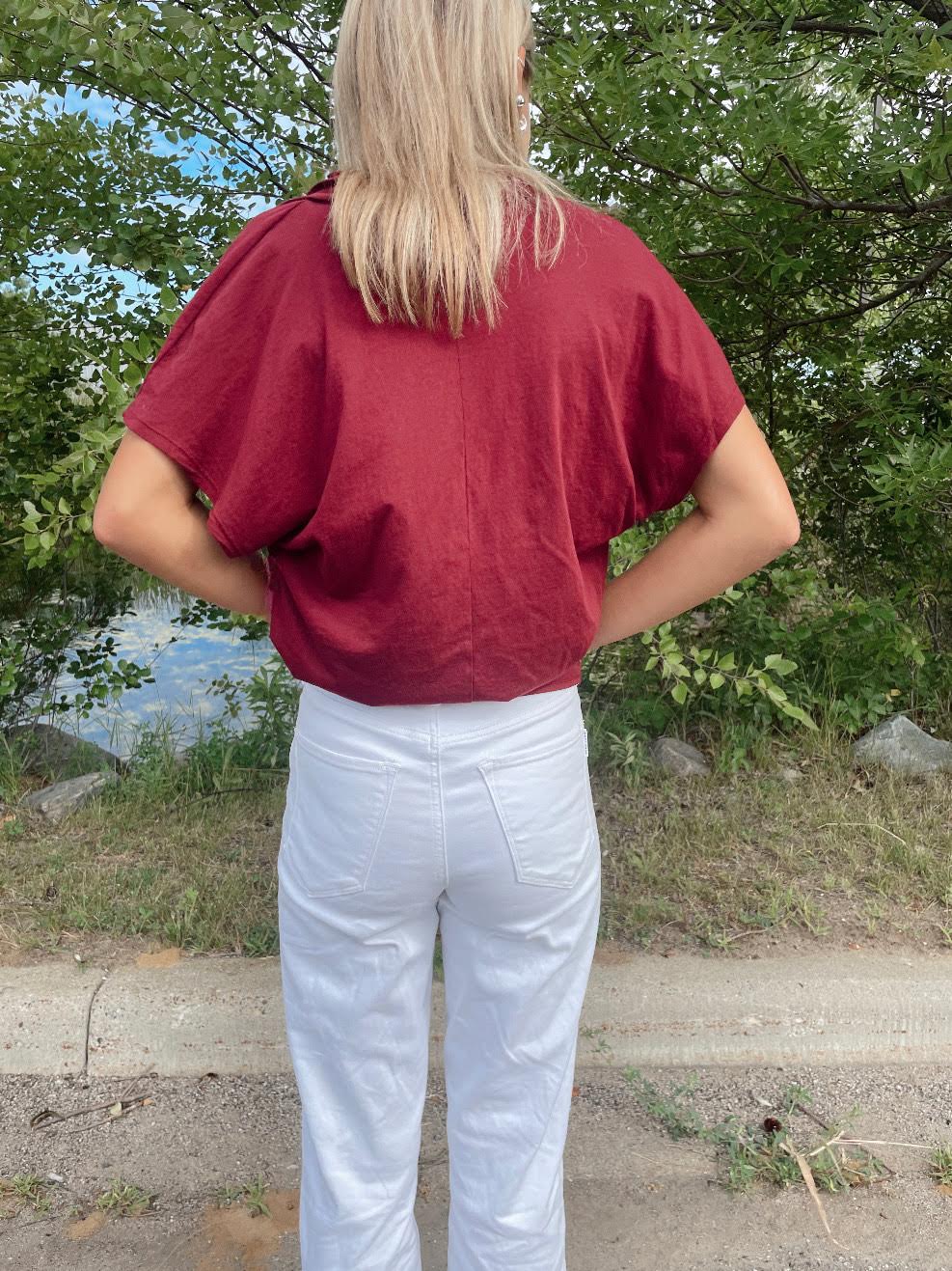 Add an effortless pop of color to your wardrobe with this twist front V-neck top. Designed in a rich, deep red shade, it features a relaxed fit with short sleeves and a flattering draped front detail that gives it just the right amount of style. Easy to dress up or down, this top pairs perfectly with denim, white jeans, or skirts for a chic look that works day to night. Soft, lightweight fabric keeps it comfortable while the twist adds a trendy touch.