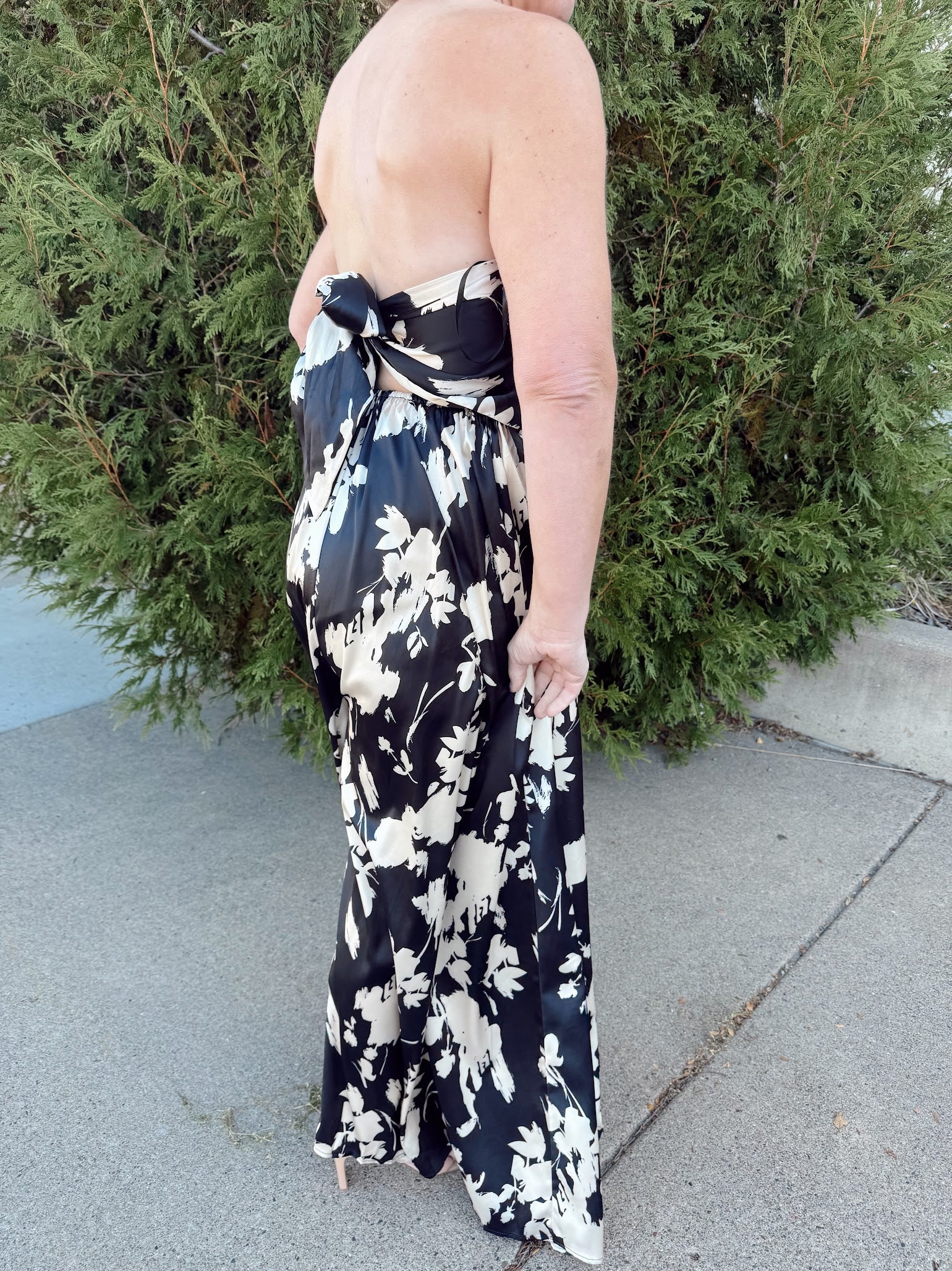 Turn heads in the Mia Strapless Jumpsuit, featuring a modern tube silhouette with a tie-back chest and elasticized back for a perfect, comfortable fit. The defined waist enhances your shape while the flowy jumpsuit offers an effortlessly polished look. Crafted from a smooth blend of polyester and spandex, it moves with you from day to night in style.
