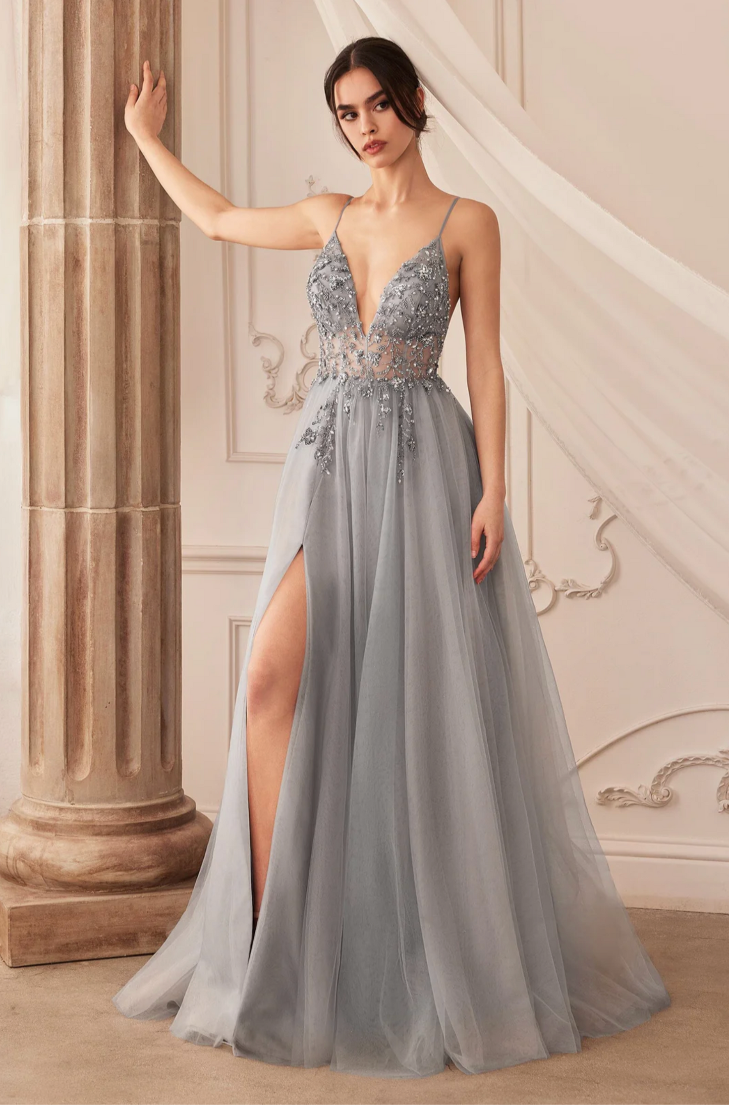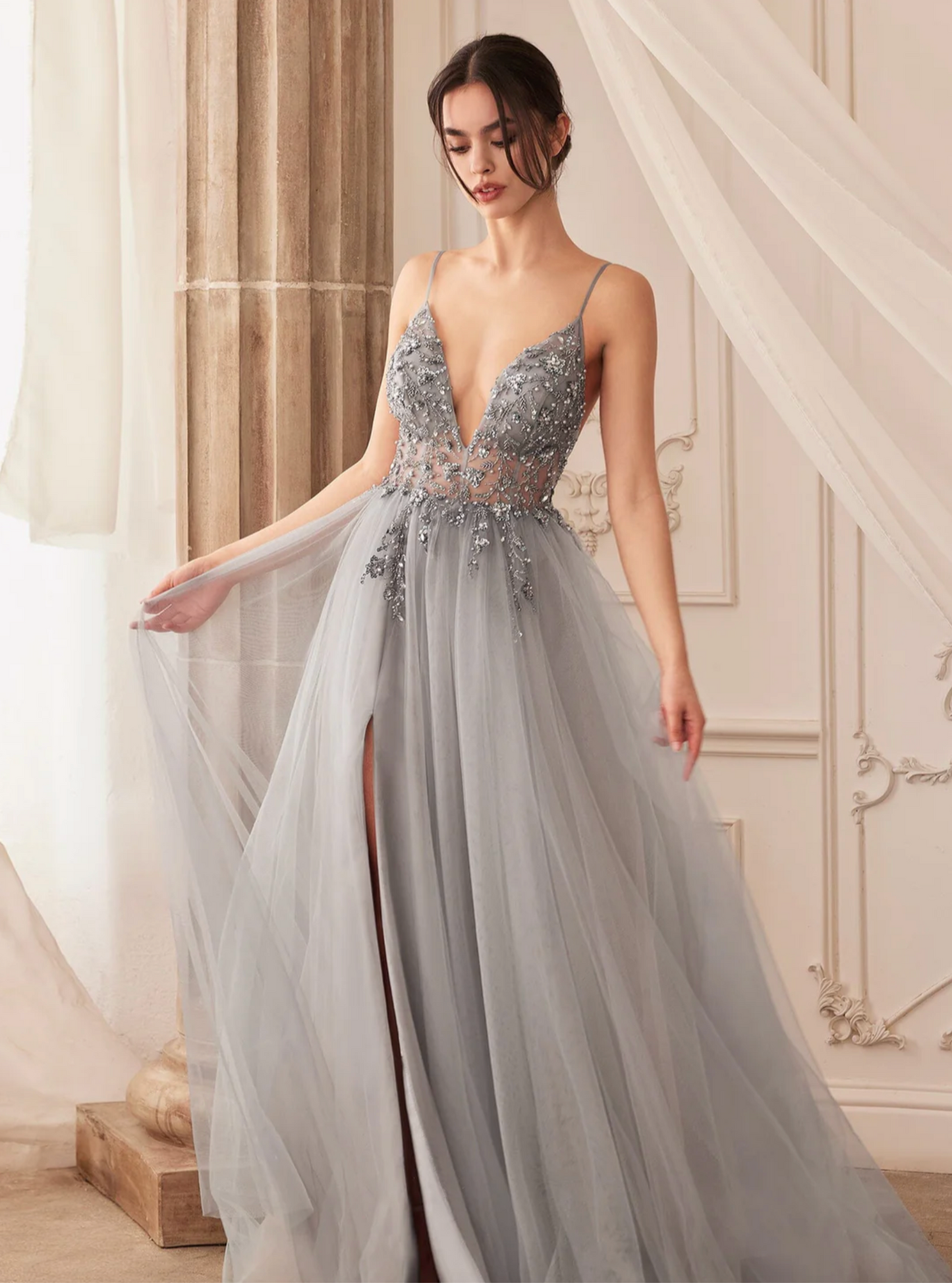 Make an unforgettable entrance in our Ophelia Gown. This stunning dress features intricate bead embellishments, a plunging V-neck bodice, and a dramatic tulle skirt with a leg slit. You'll feel confident and glamorous in this fully lined, floor-length gown that is sure to turn heads. Perfect for any special occasion! Dont see your size or color available? Call us today for a special order!