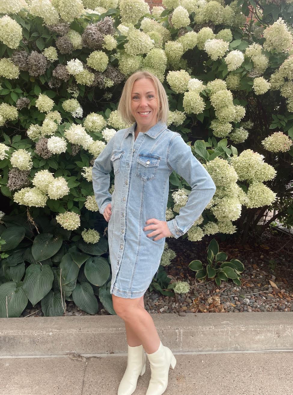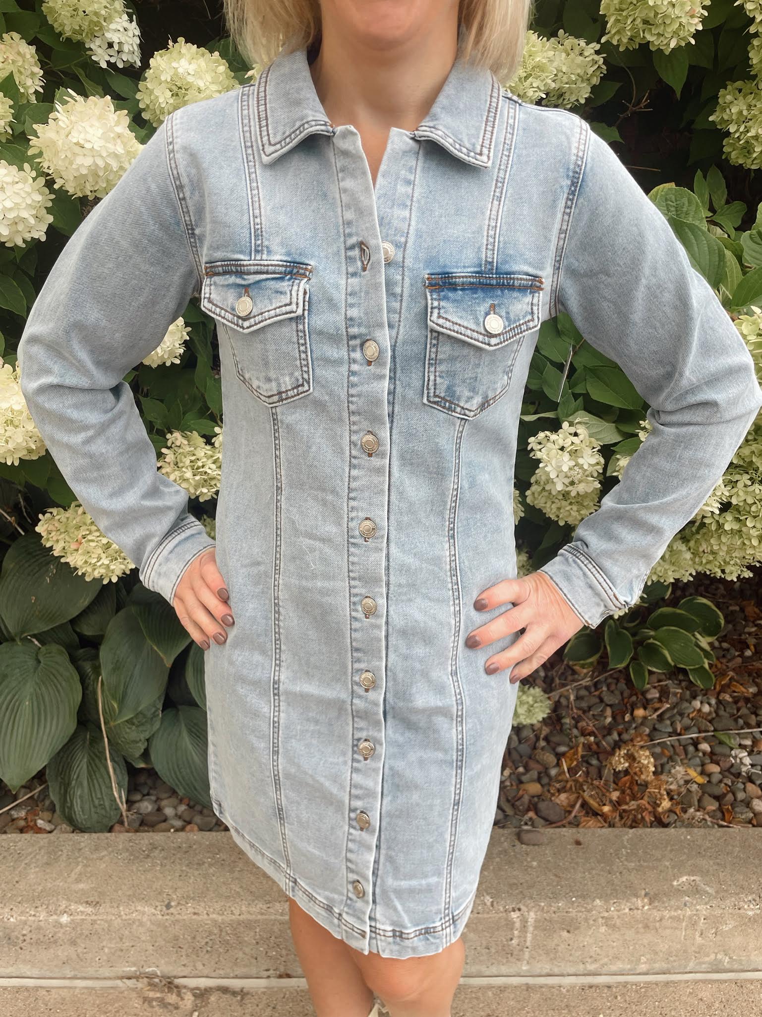 Forever cool and classic, the Ora Denim Dress is a wear-anywhere mini designed in a fitted silhouette with timeless denim appeal. Featuring long sleeves, a collared V-neckline, and a full button-front closure, it strikes the perfect balance between casual and polished. Dual chest pockets add a utility-inspired touch, while the soft, stretchy fabric blend ensures all-day comfort and a flattering fit.