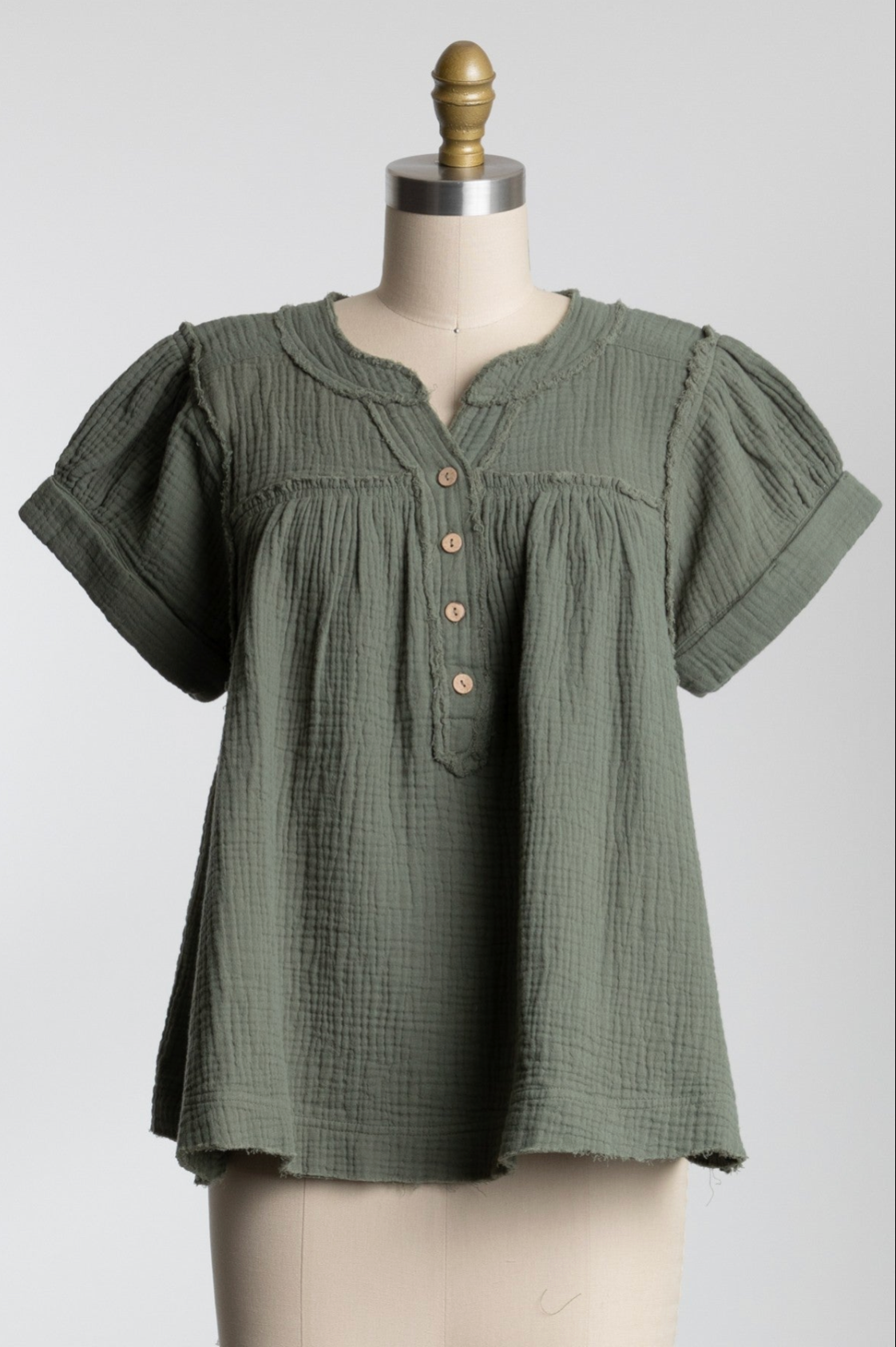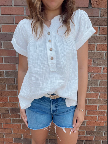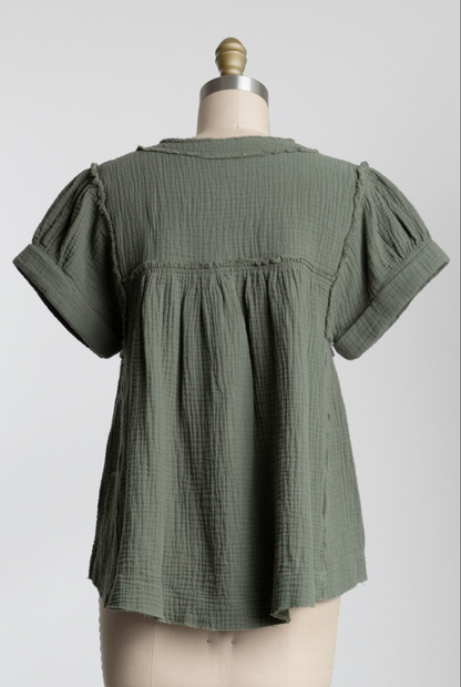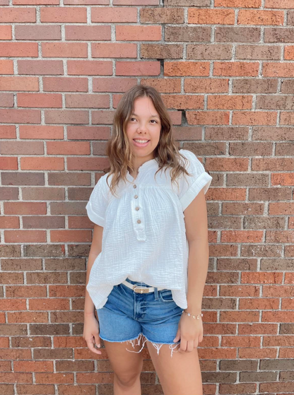 The Peter Top features a charming babydoll silhouette with frayed detailing and short sleeves for a relaxed yet feminine look. This versatile piece offers both comfort and style, perfect for casual outings or dressed up with your favorite accessories.