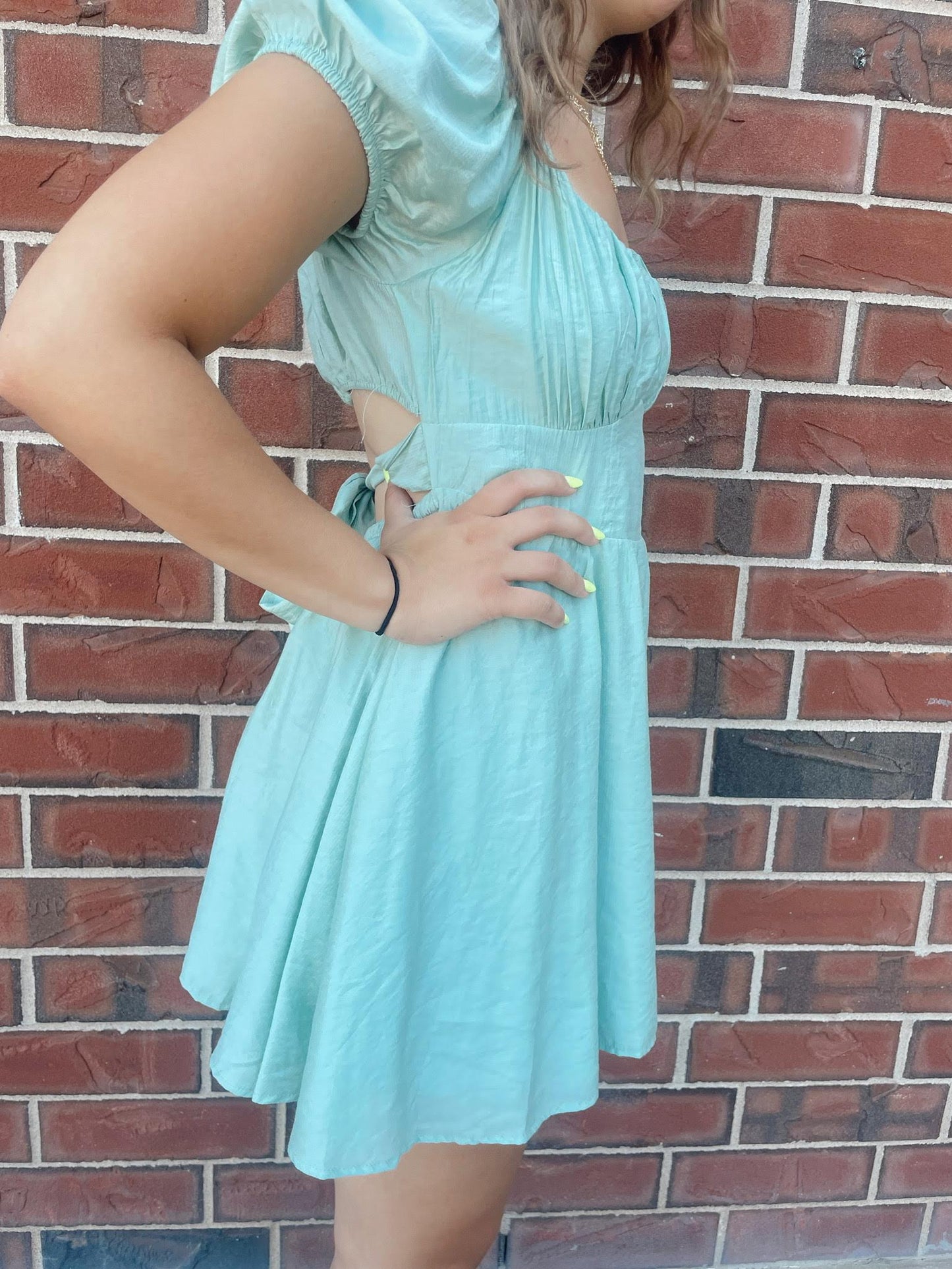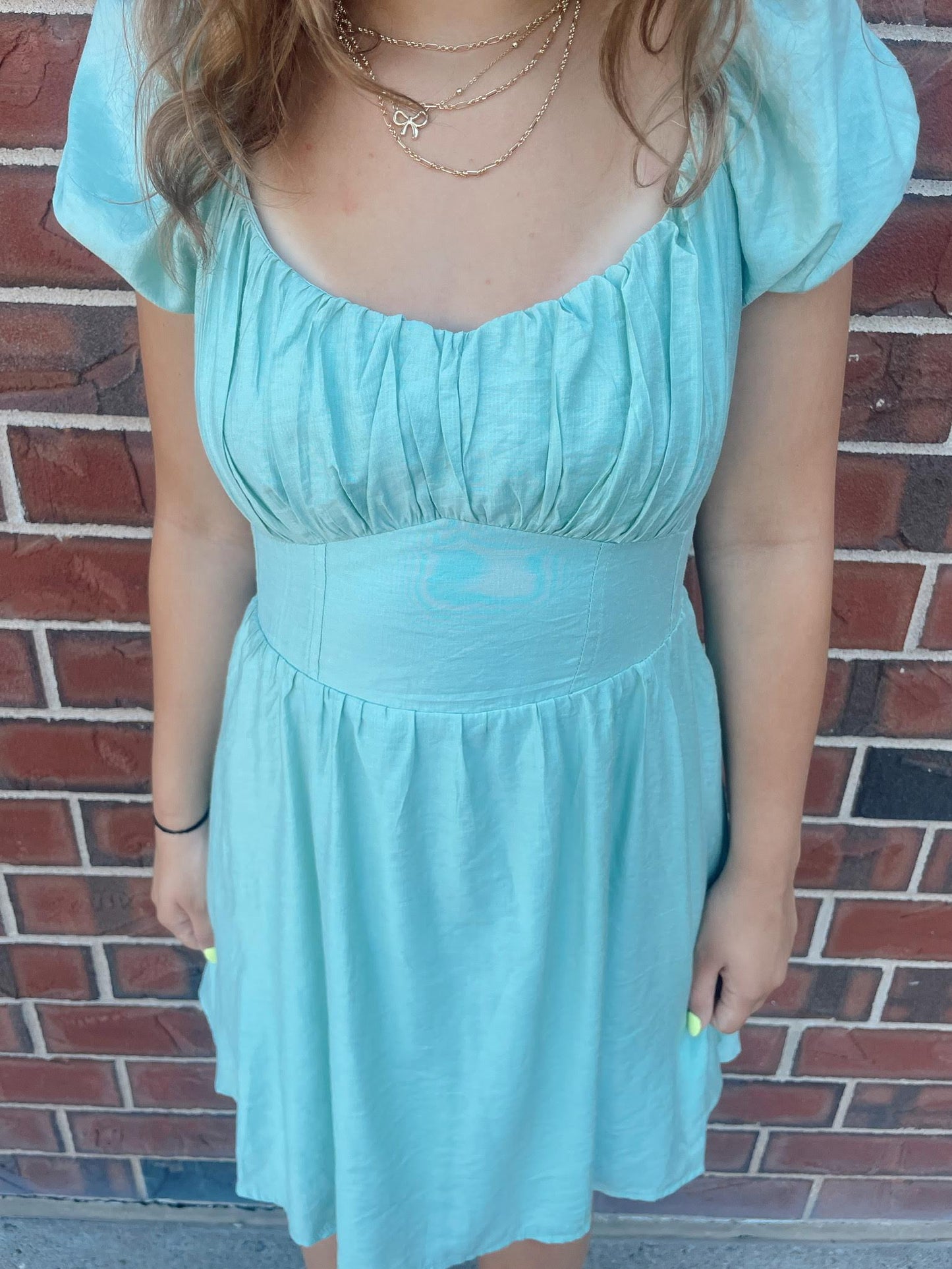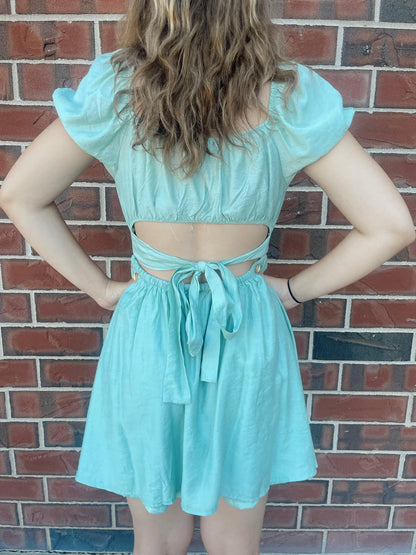 This Quinny Mini Dress is everything you need for a fun night out. The scoop neckline and short puff sleeves give a flirty touch, while the pleated bust and corset detail provide the perfect amount of elegance. The back tie and cut-out add a unique twist to this solid, lined mini dress.