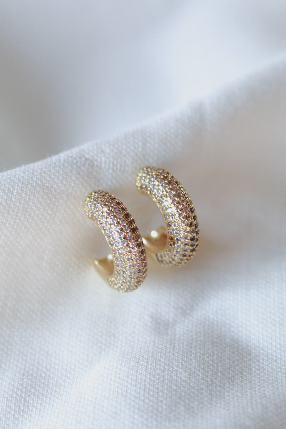 The Sax Hoop Earrings are fully encrusted with sparkling gems, creating a dazzling mini hoop that effortlessly catches the light. These versatile hoops add a touch of glamour to any outfit, whether casual or dressy. Crafted with gold filled metal, designed to be hypoallergenic, and offered as a final sale piece for exclusive style.