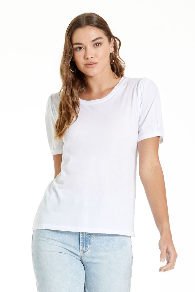 Puff short sleeve crew neck top finished with shoulder shirrings. Solid color knit on regular fit, styled with solid color ribbed neck.