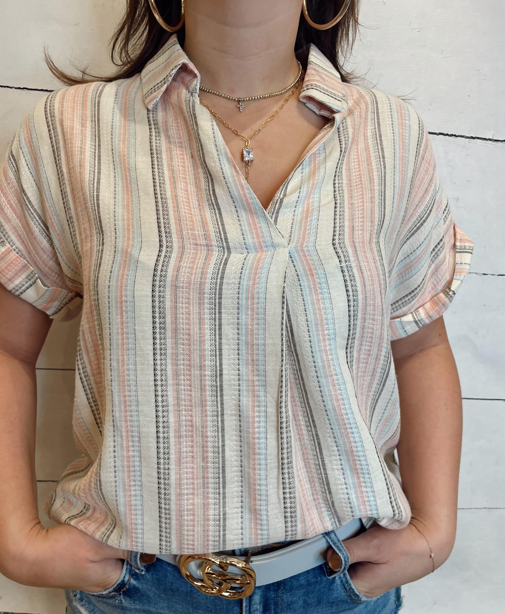 Rock the season in our Tobias Top! This striped t-shirt blouse features a stylish collar and comes in two adorable colorways. Stay chic and comfortable with this must-have addition to your wardrobe. Pair with your favorite jeans or skirt for a versatile look. (Pssst... get it in both colors for extra awesomeness!)