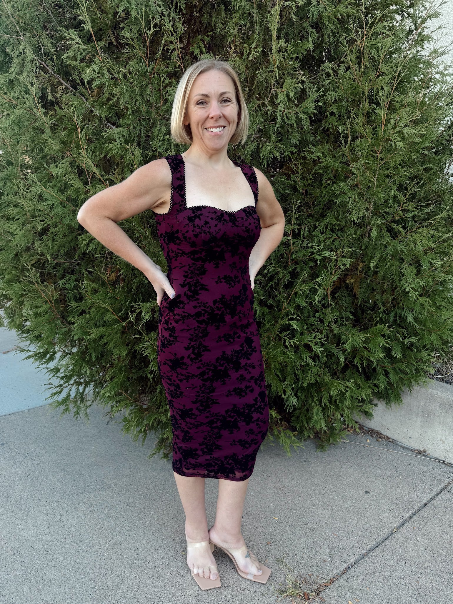 Turn heads in this elegant plum midi dress featuring a rich velvet floral overlay that adds texture and depth. The fitted silhouette hugs your curves in all the right places, while the square neckline and wide straps create a timeless, feminine look. Perfect for evening events or holiday gatherings, this dress pairs beautifully with a faux fur wrap or simple heels for a chic, polished finish.