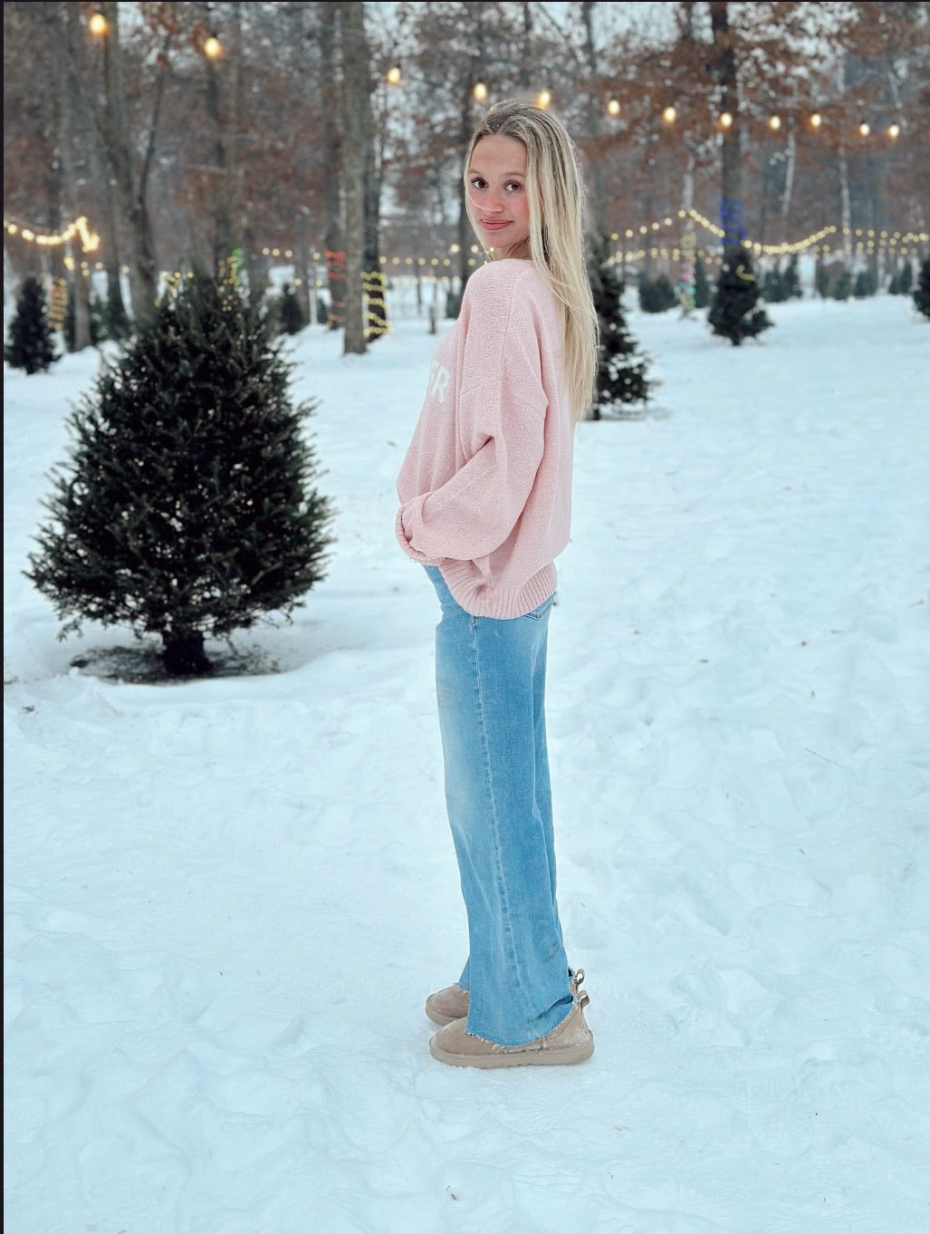 Wrap yourself in cozy charm with our Wine Weather Sweater, a lightweight knit crafted in a soft light pink hue. Designed with a classic crew neckline, this stylish piece features ivory “Wine Weather” text across the front, adding a playful touch to your cool-weather wardrobe. Made from a comfortable blend of 75% acrylic and 25% nylon, it offers the perfect balance of softness, stretch, and warmth. Whether you’re settling in for a relaxed evening or heading out for a casual day, this graphic sweater is the perfect companion for every wine-worthy moment. ✨